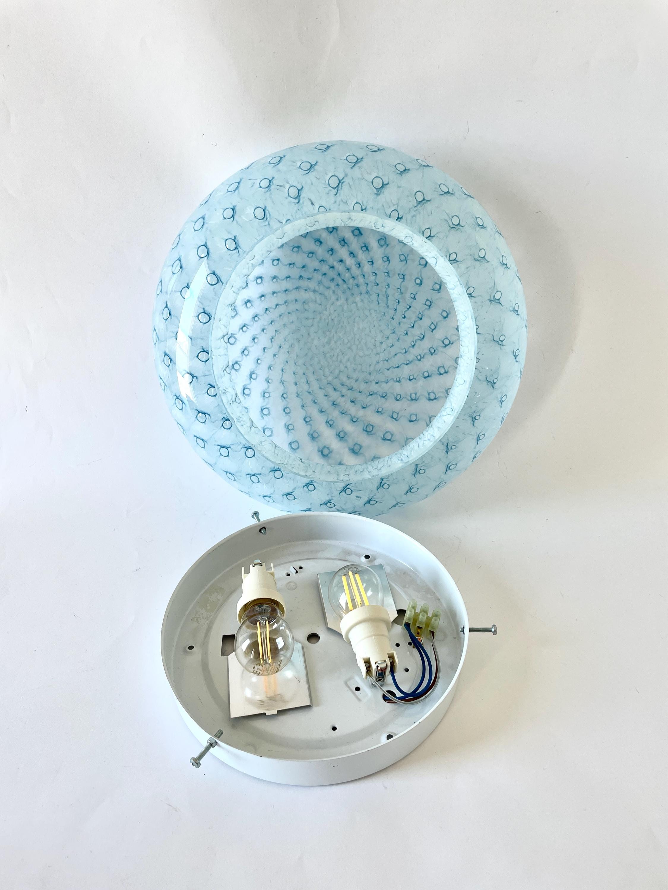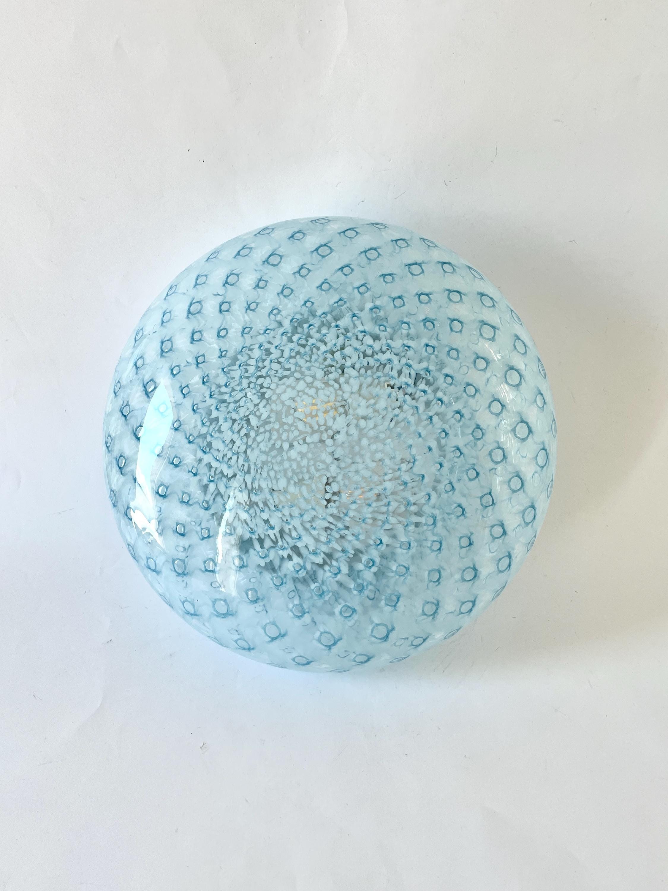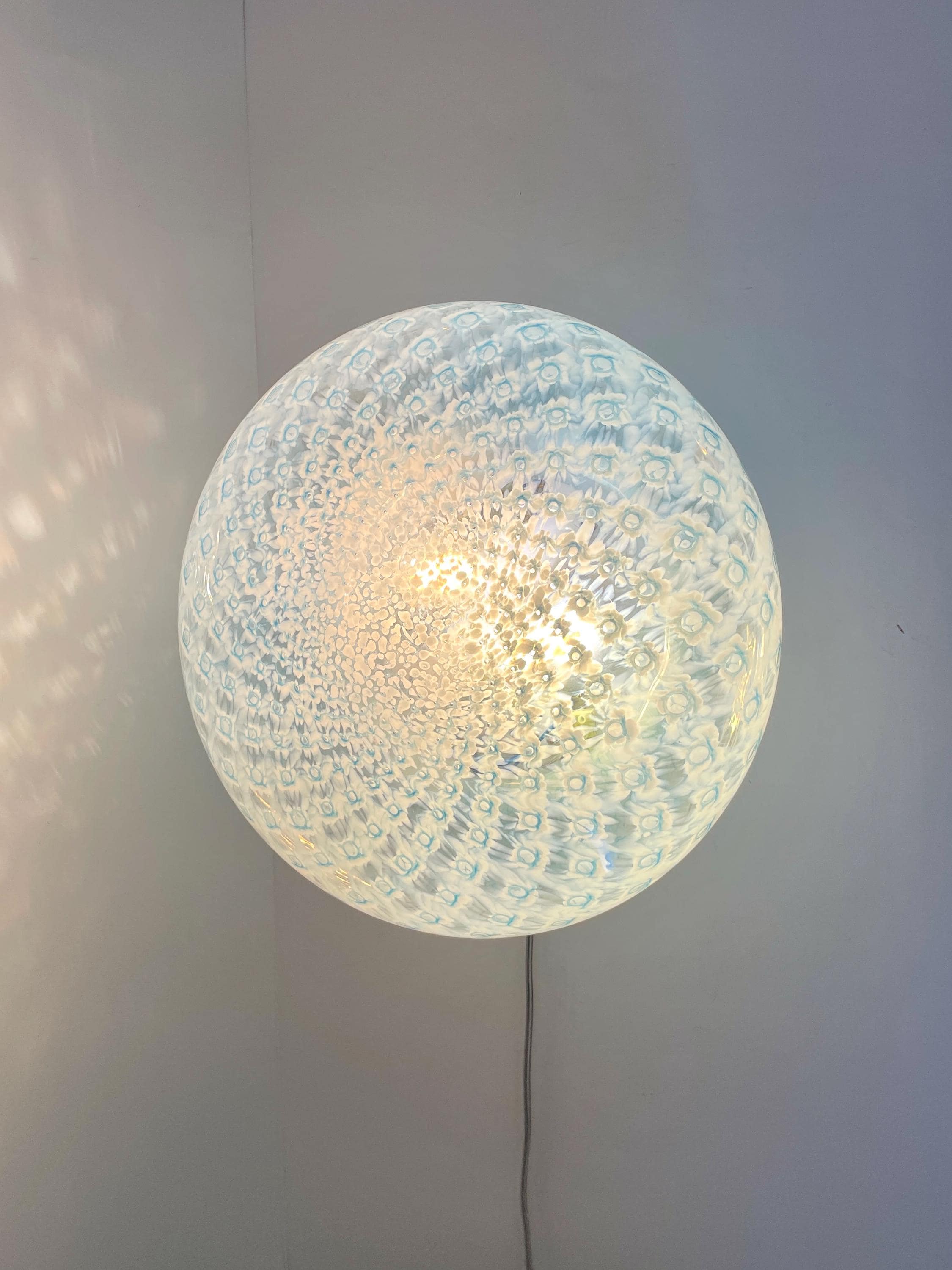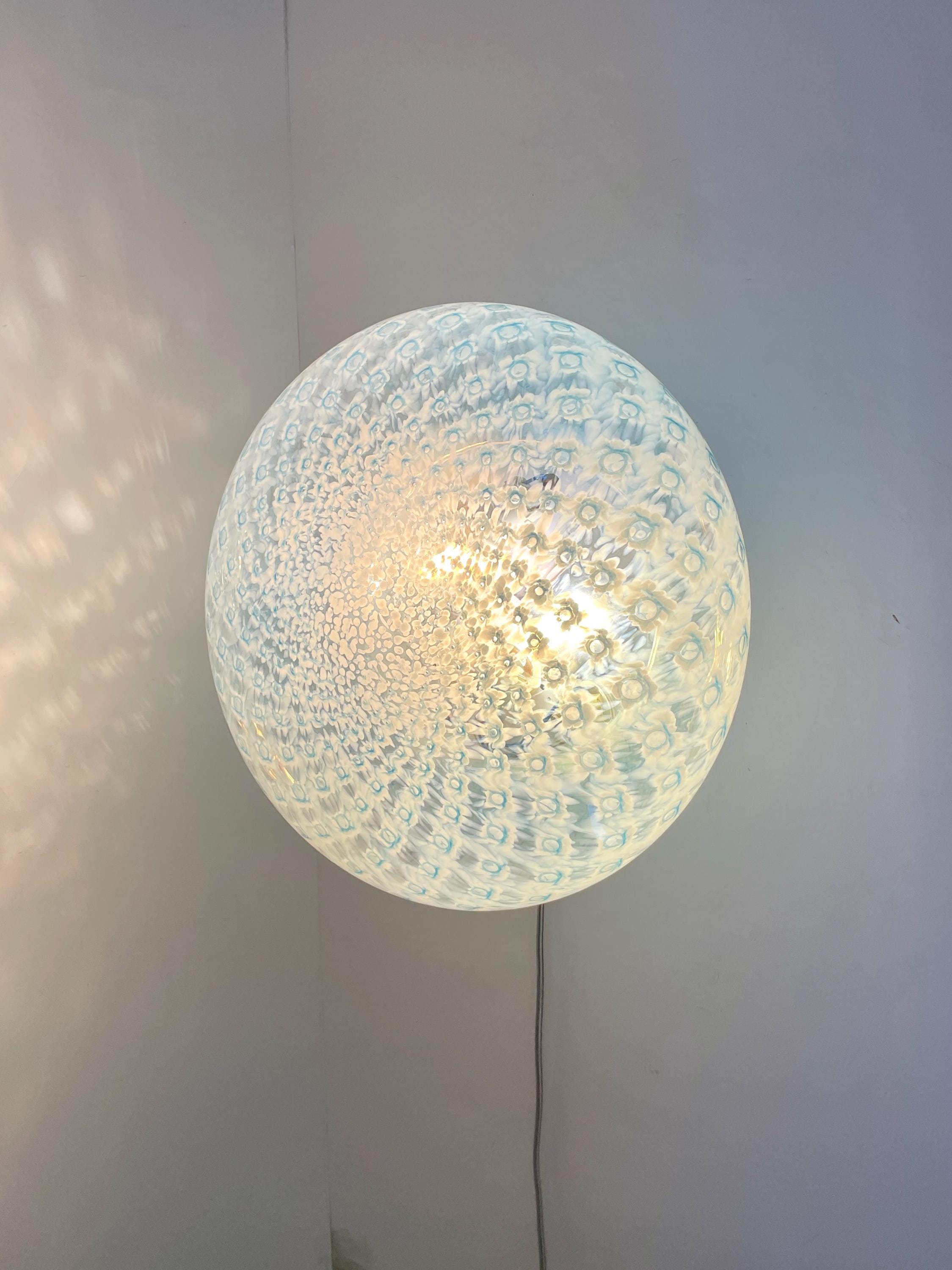 MACRAME' 35 by LA MURRINA is a splendid wall or ceiling lamp, vintage from the 90s, with beautiful Murano glass, mouth-blown and hand-crafted by master glassmakers of Murano, in the peacock polka dot technique, in light blue.