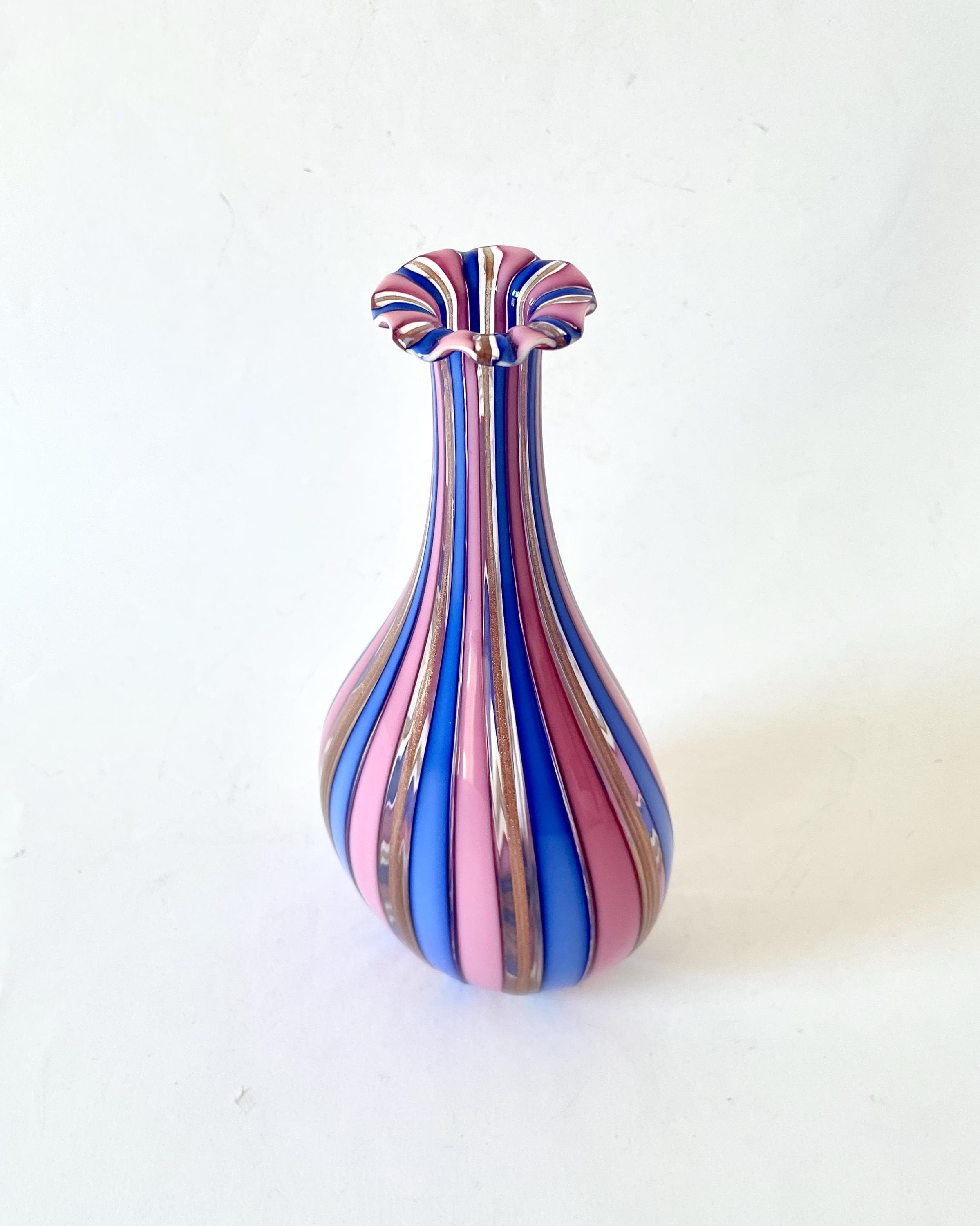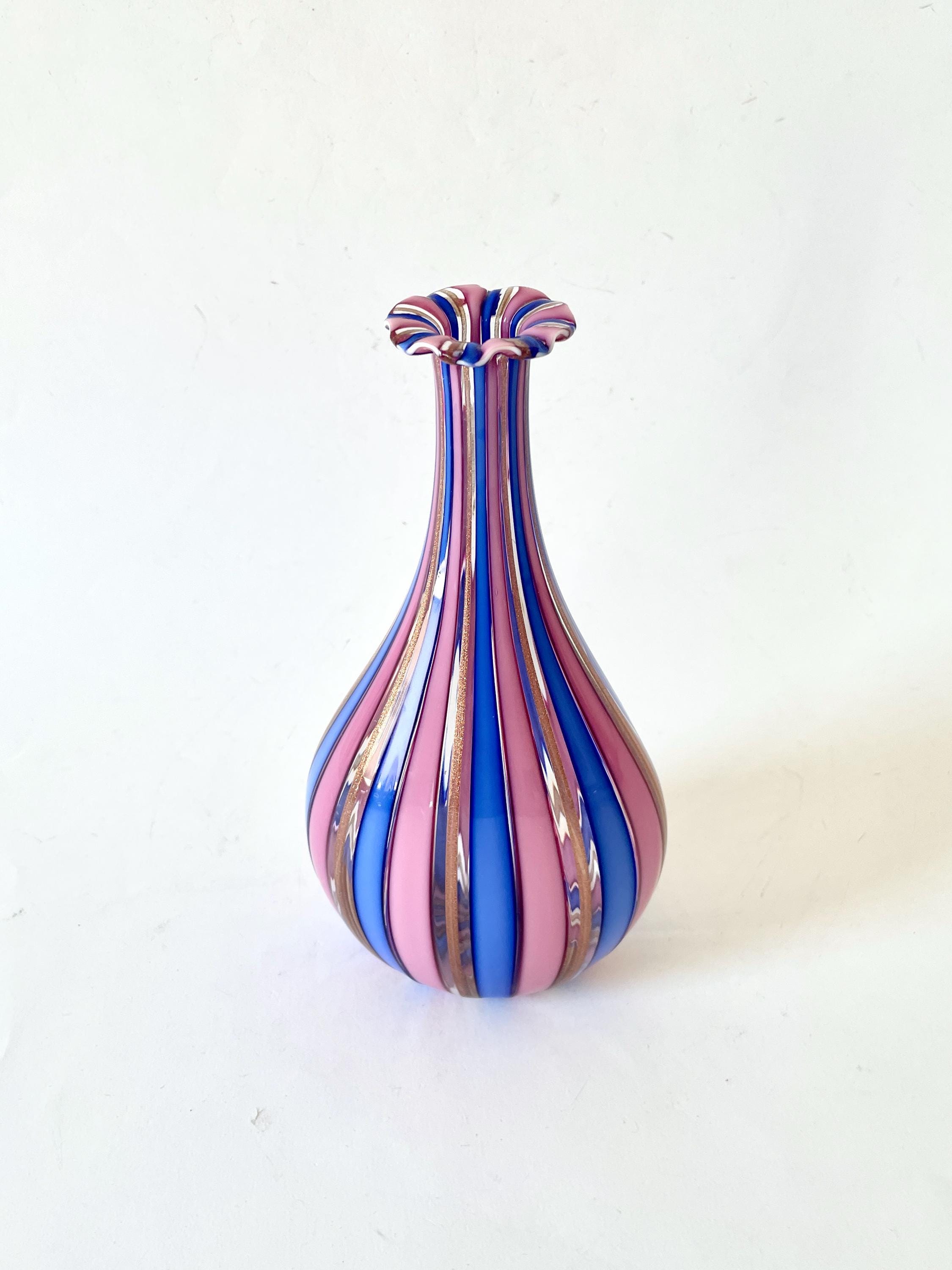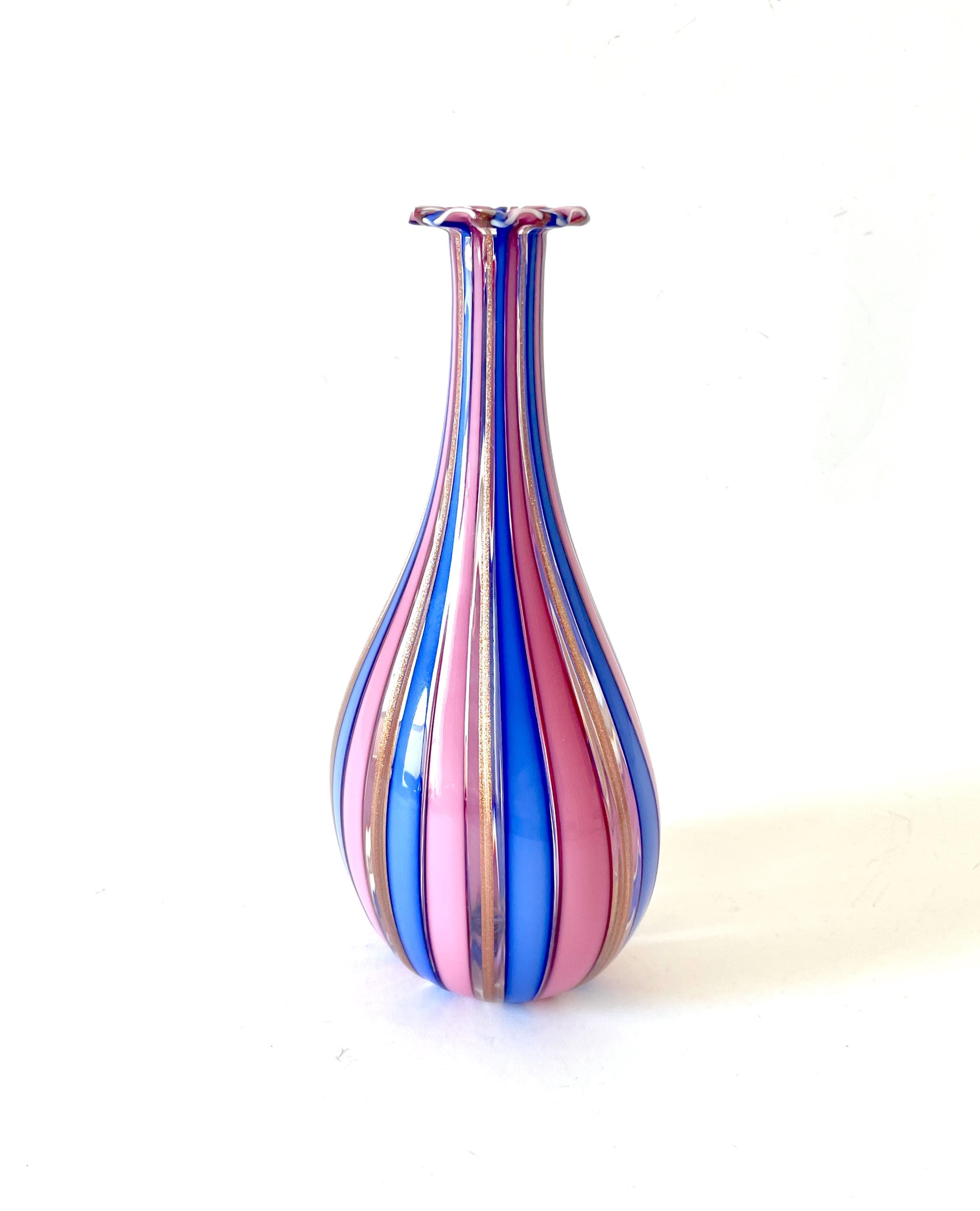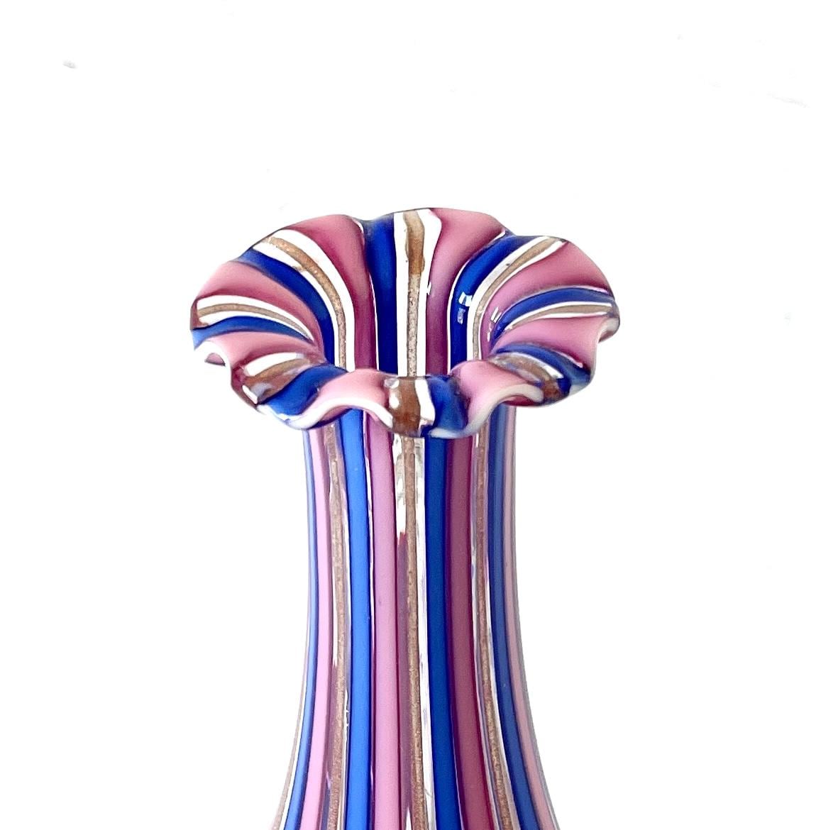 The vase was mouth-blown and made entirely by hand by skilled Murano glass masters using filigree and colored canes.
