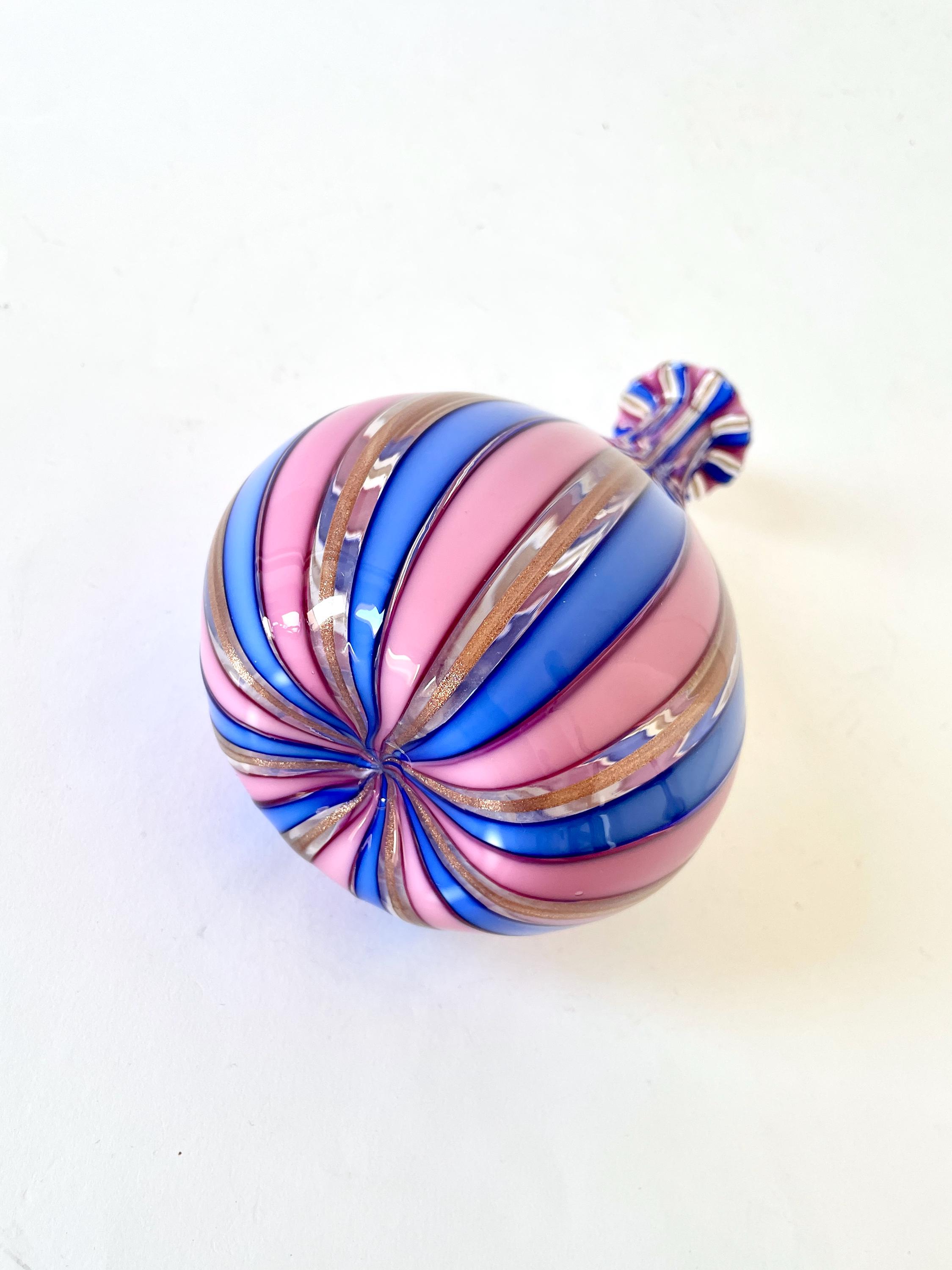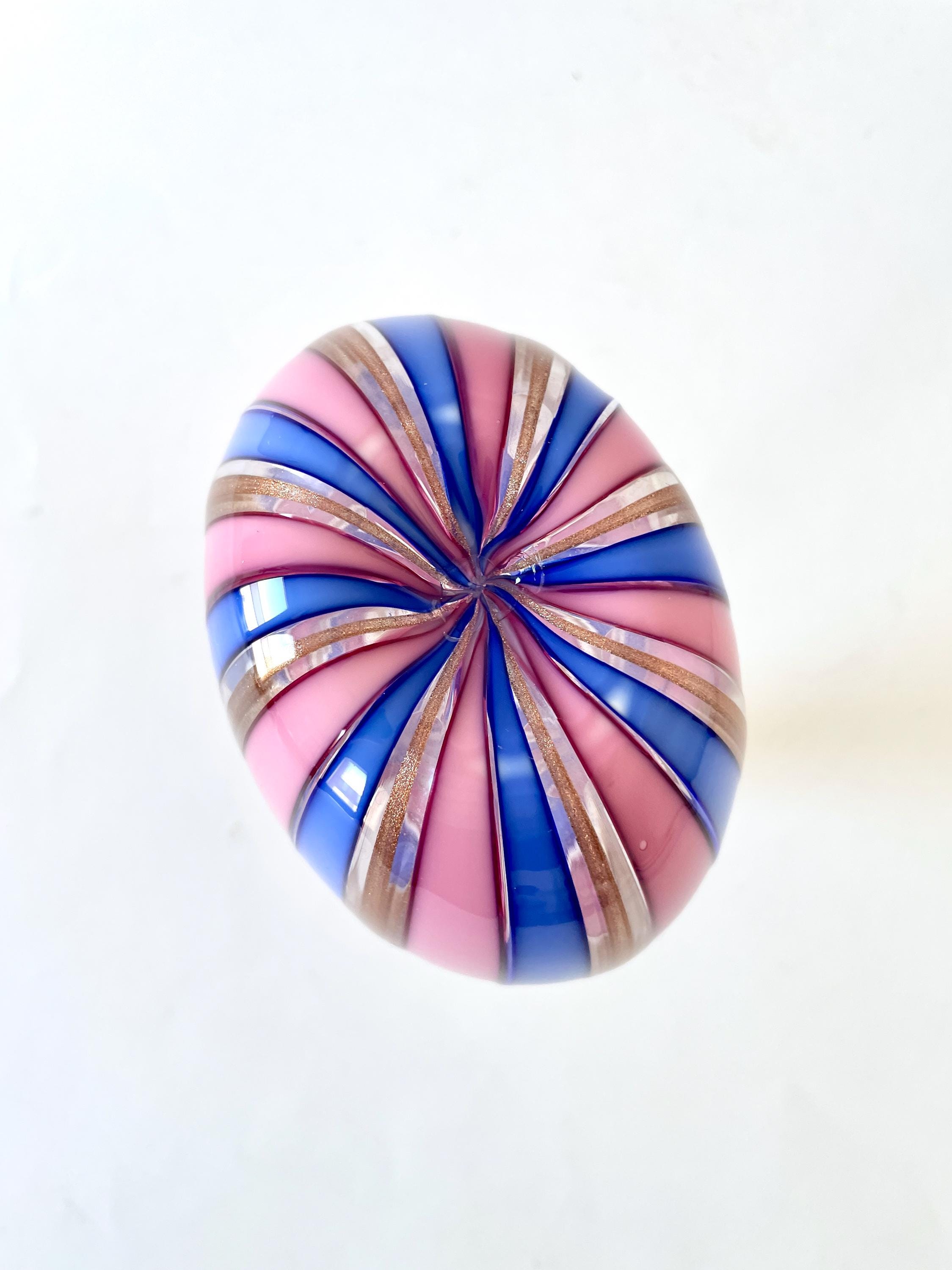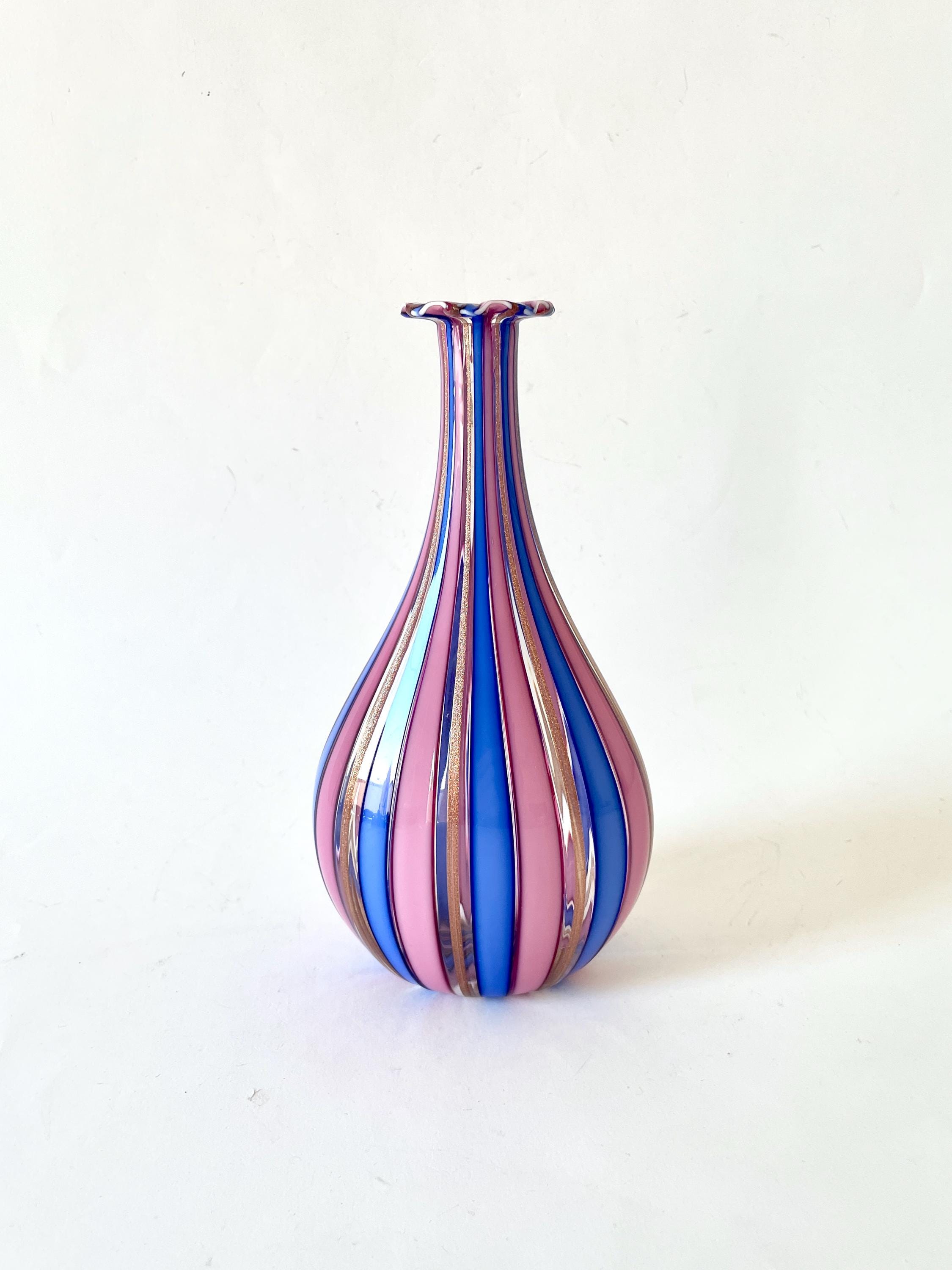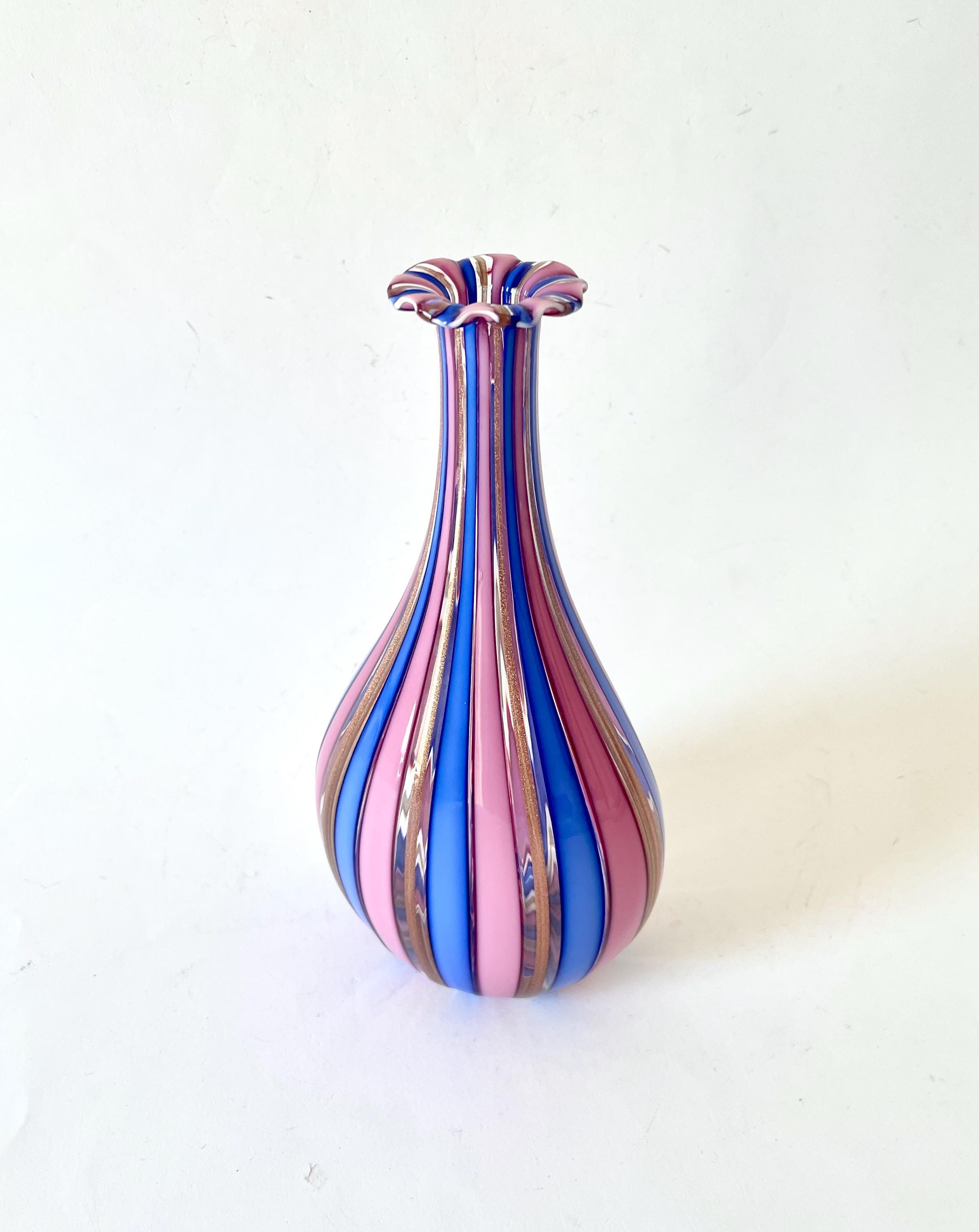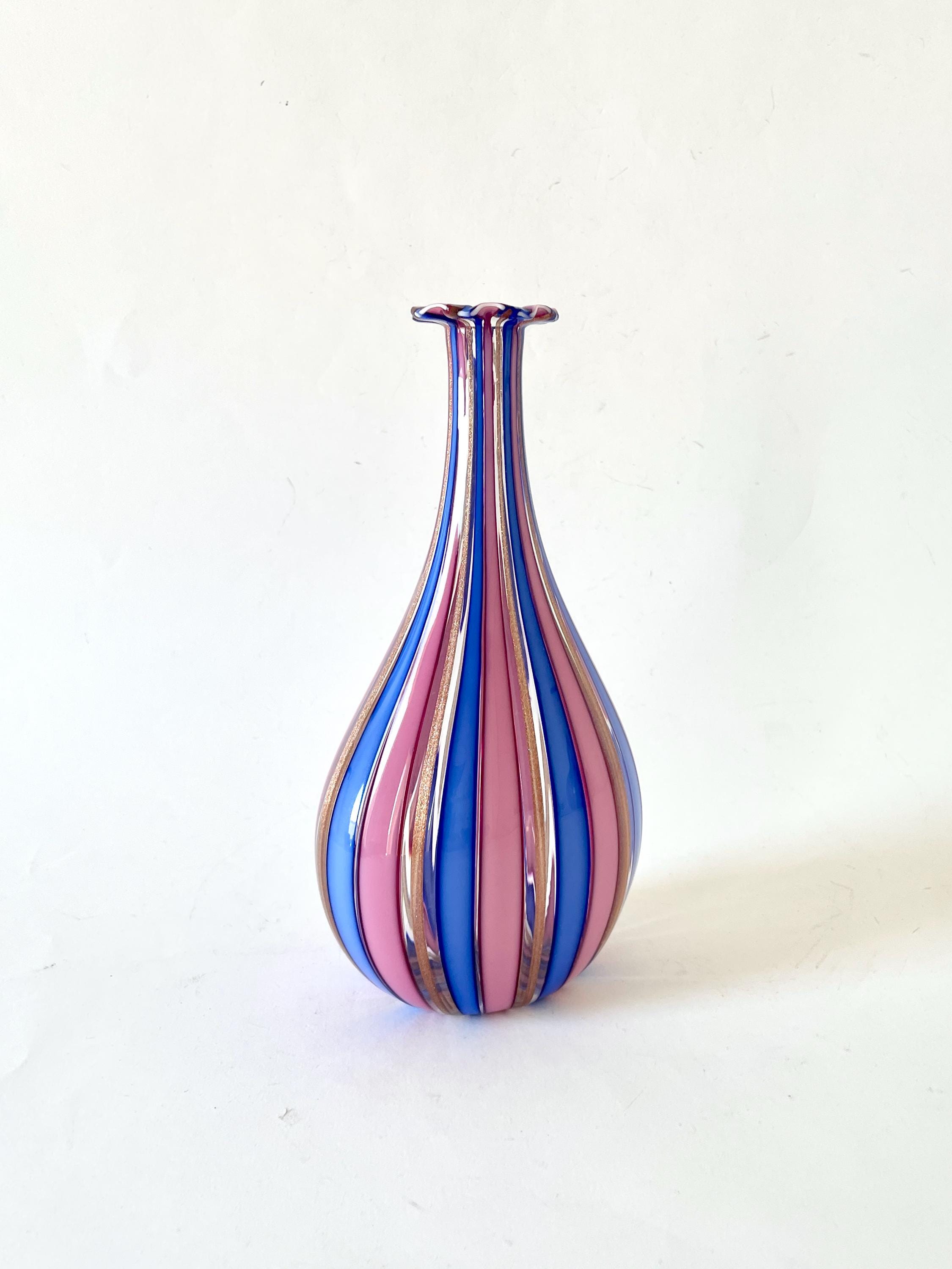 The vase was mouth-blown and made entirely by hand by skilled Murano glass masters using filigree and colored canes.
