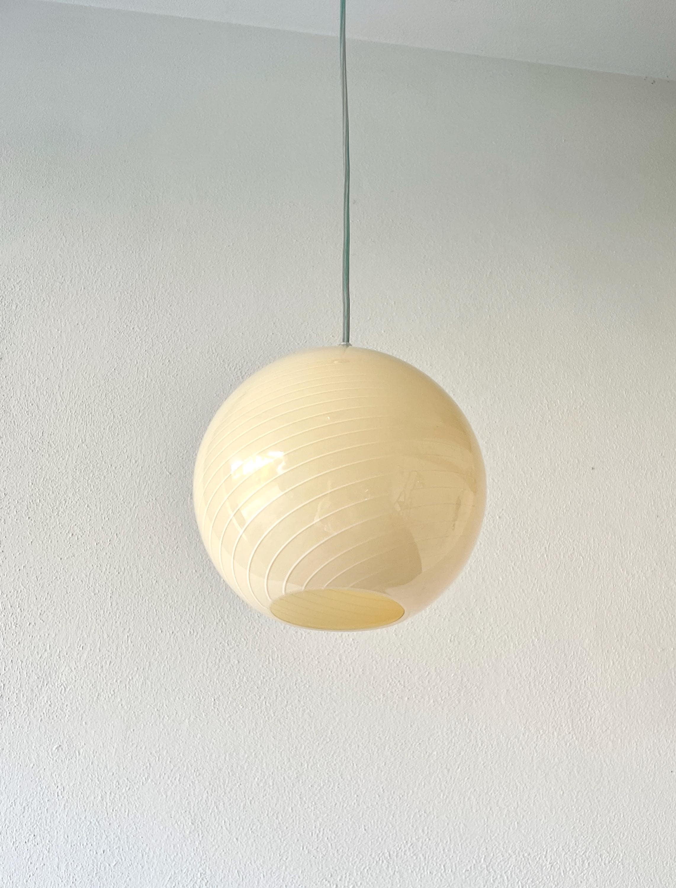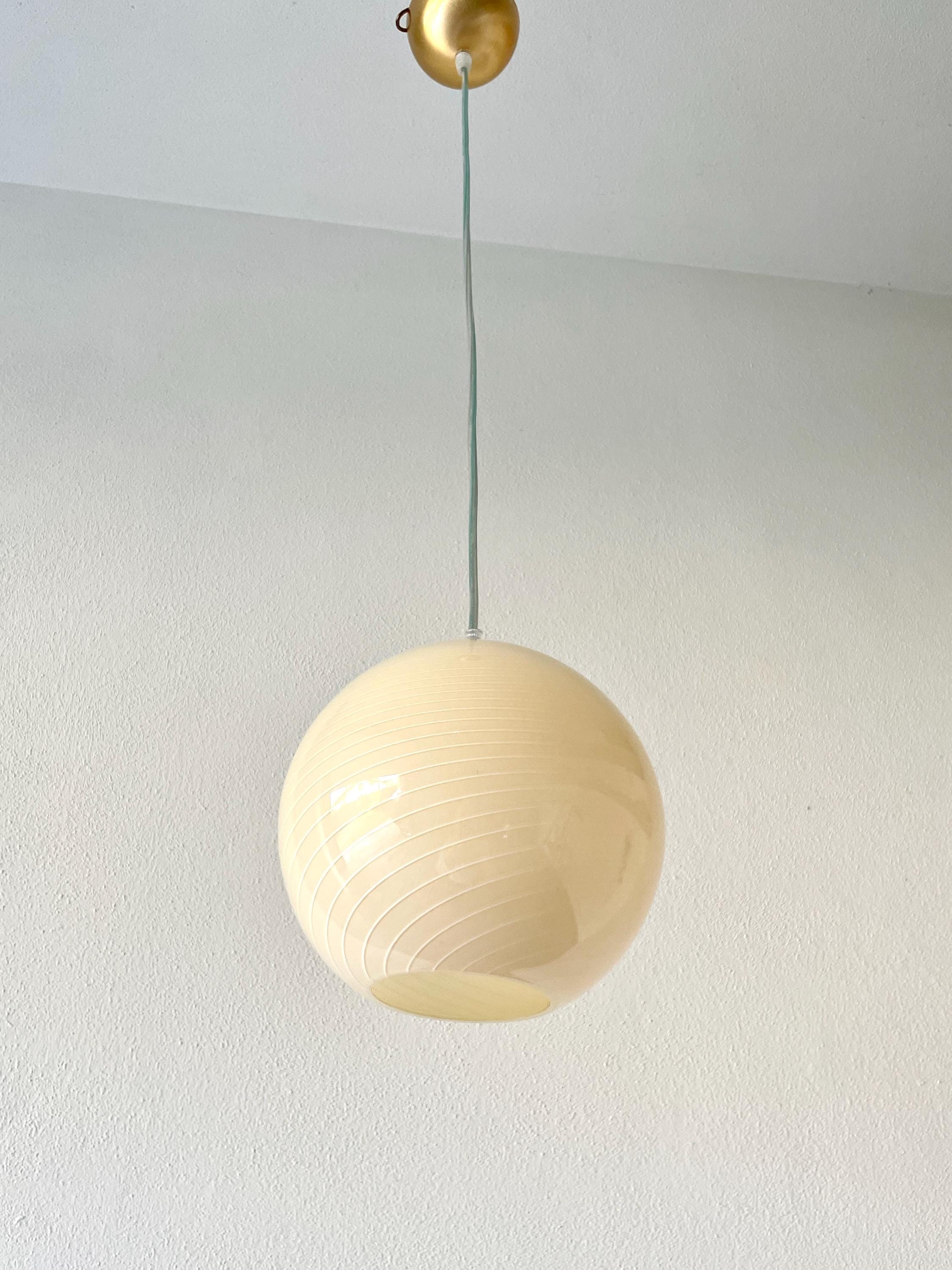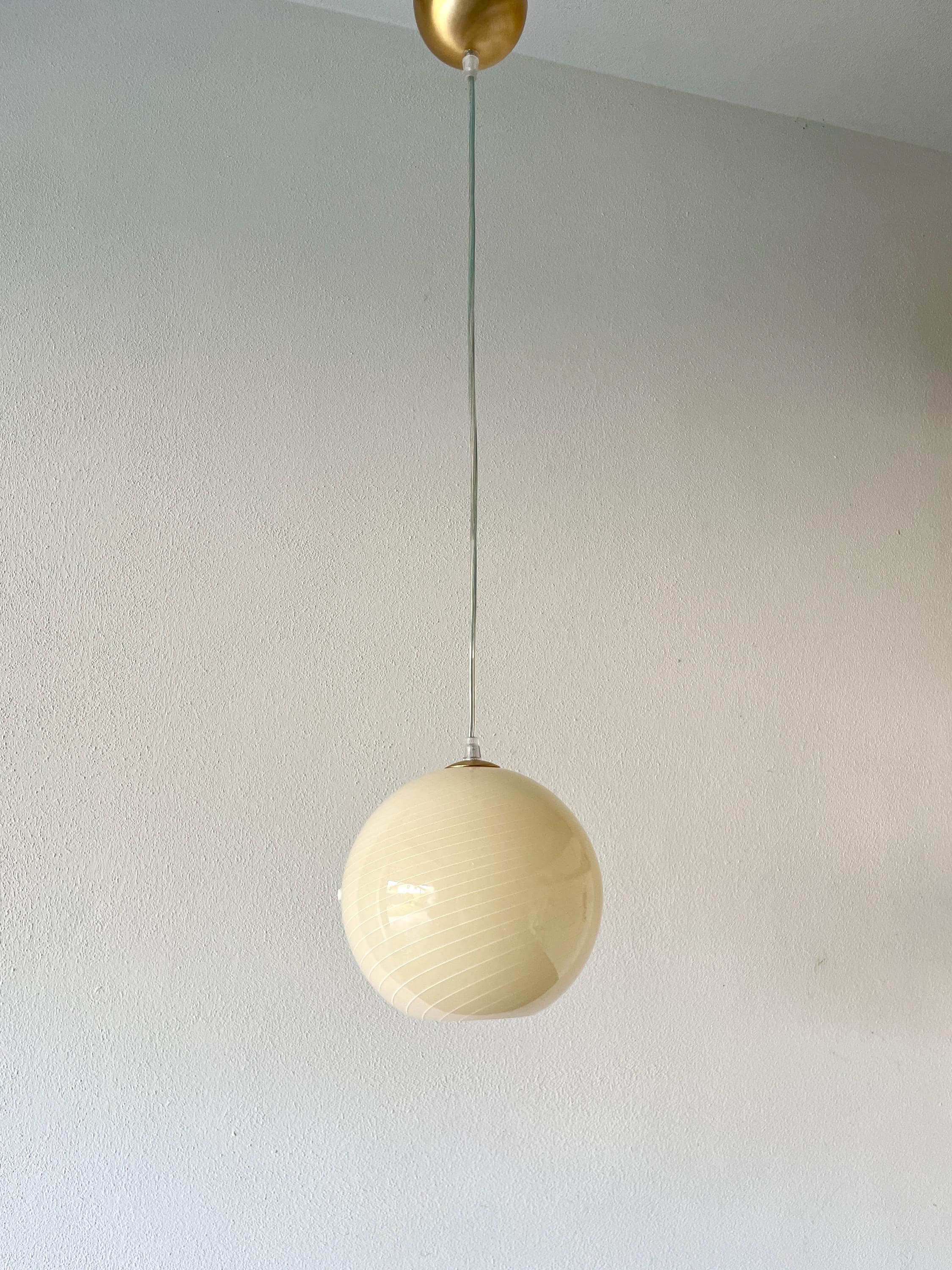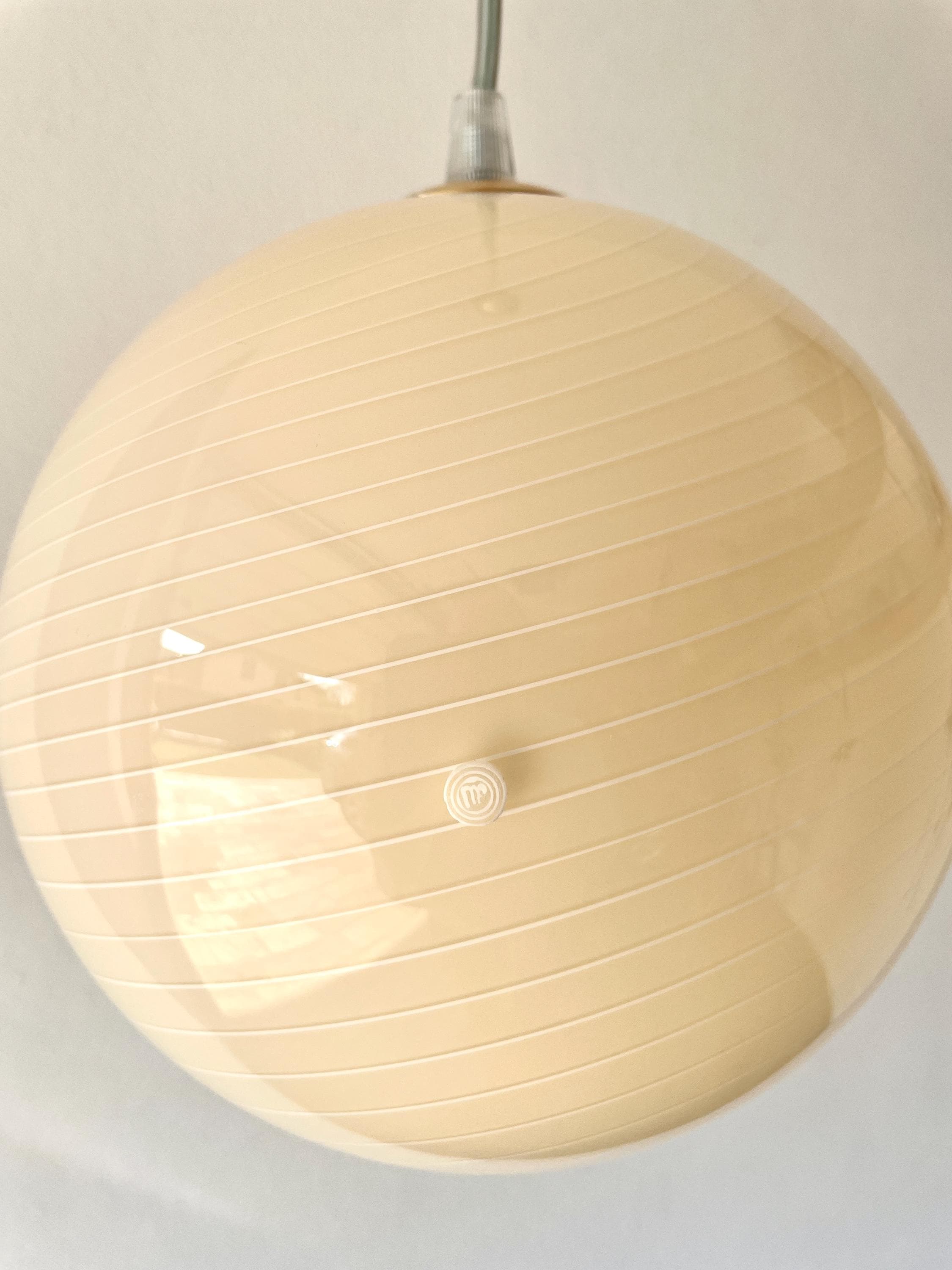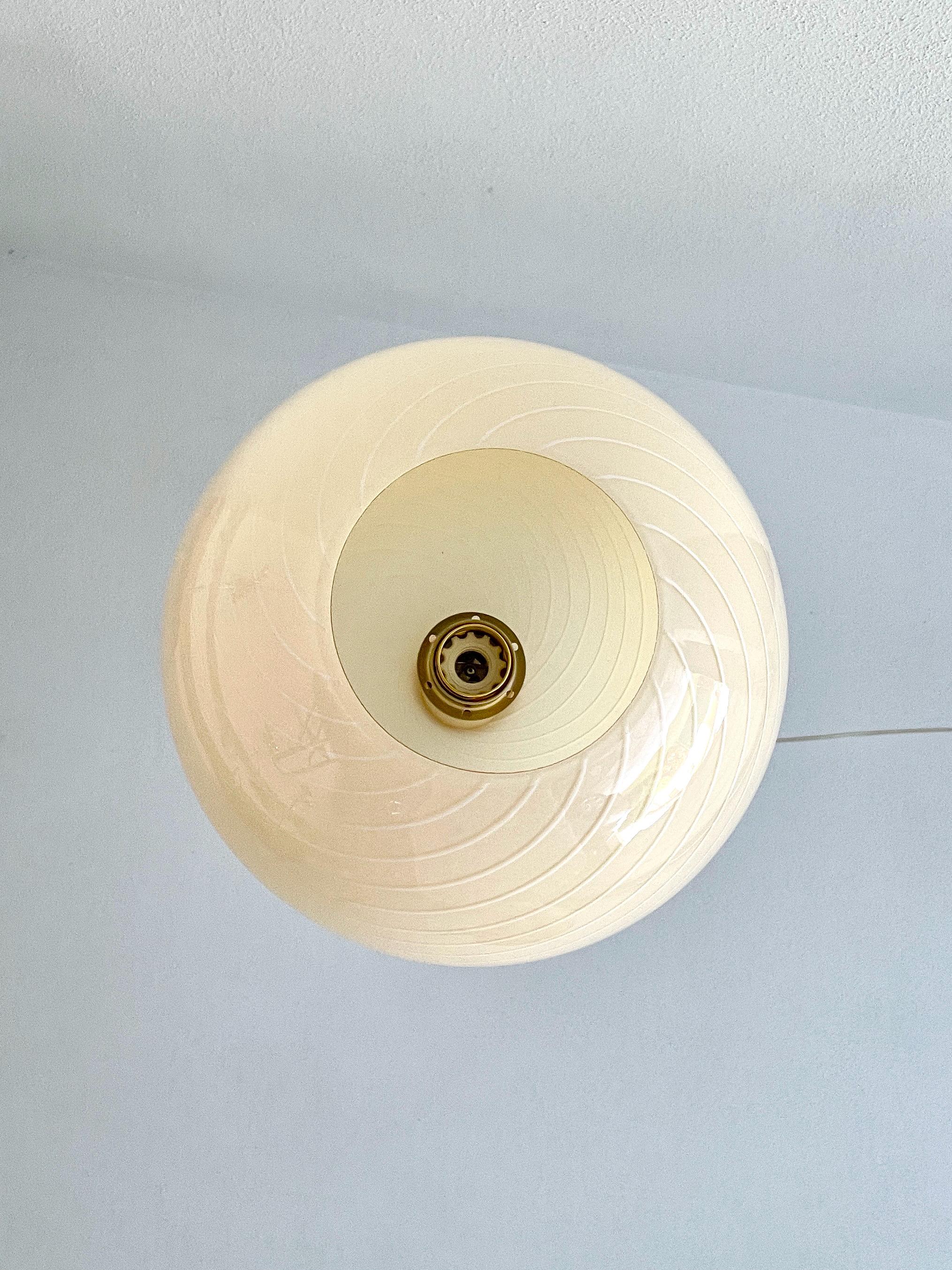CALLA ceiling 20 by LA MURRINA is a splendid chandelier, vintage from the 90s, unused, with beautiful Murano glass, spherical in shape, mouth-blown and hand-crafted by master glassmakers of Murano, using the ancient filigree technique, in this case it is very fine white on a warm cream color.