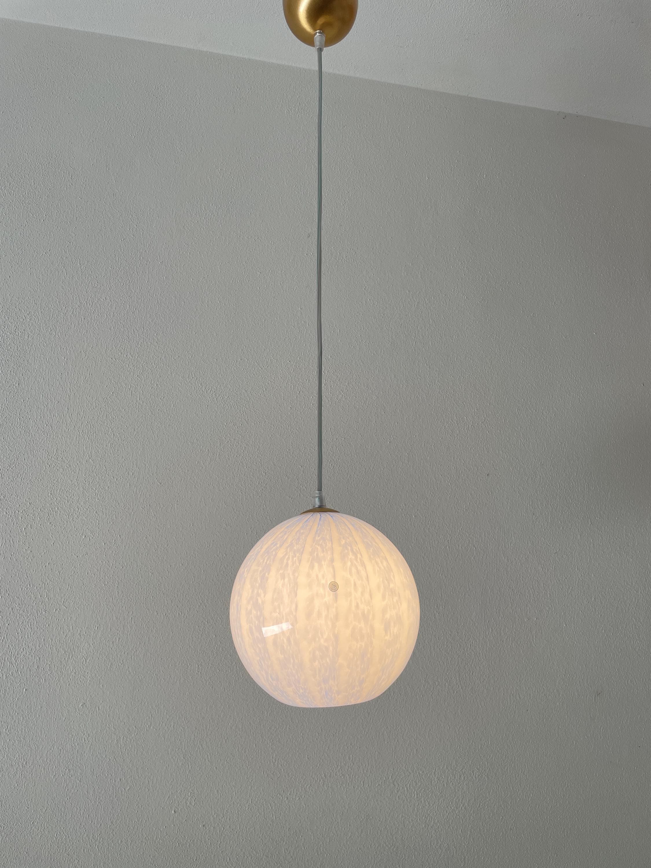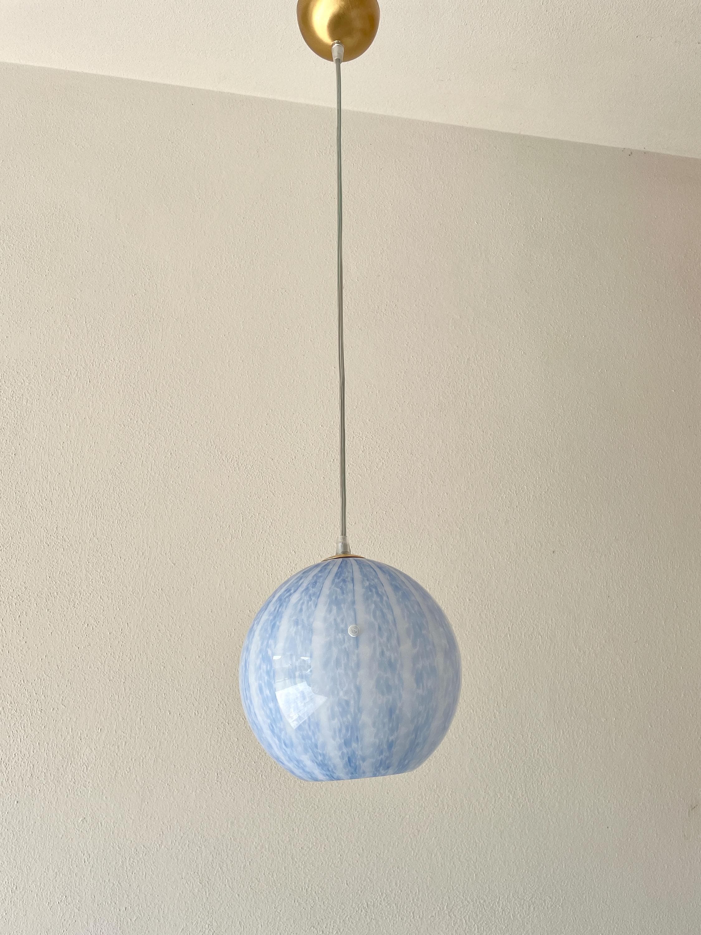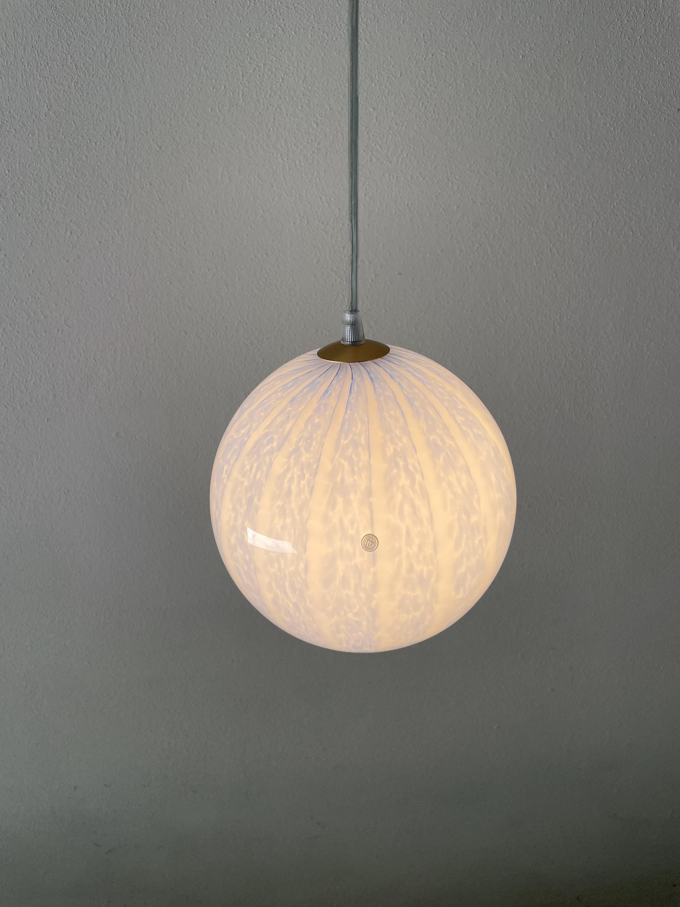 Gorgeous, vintage, unused 1990s Murano glass chandelier. Spherical in shape, mouth-blown and hand-crafted by Murano master glassmakers, the vertical motif is created by countless blue glass beads.