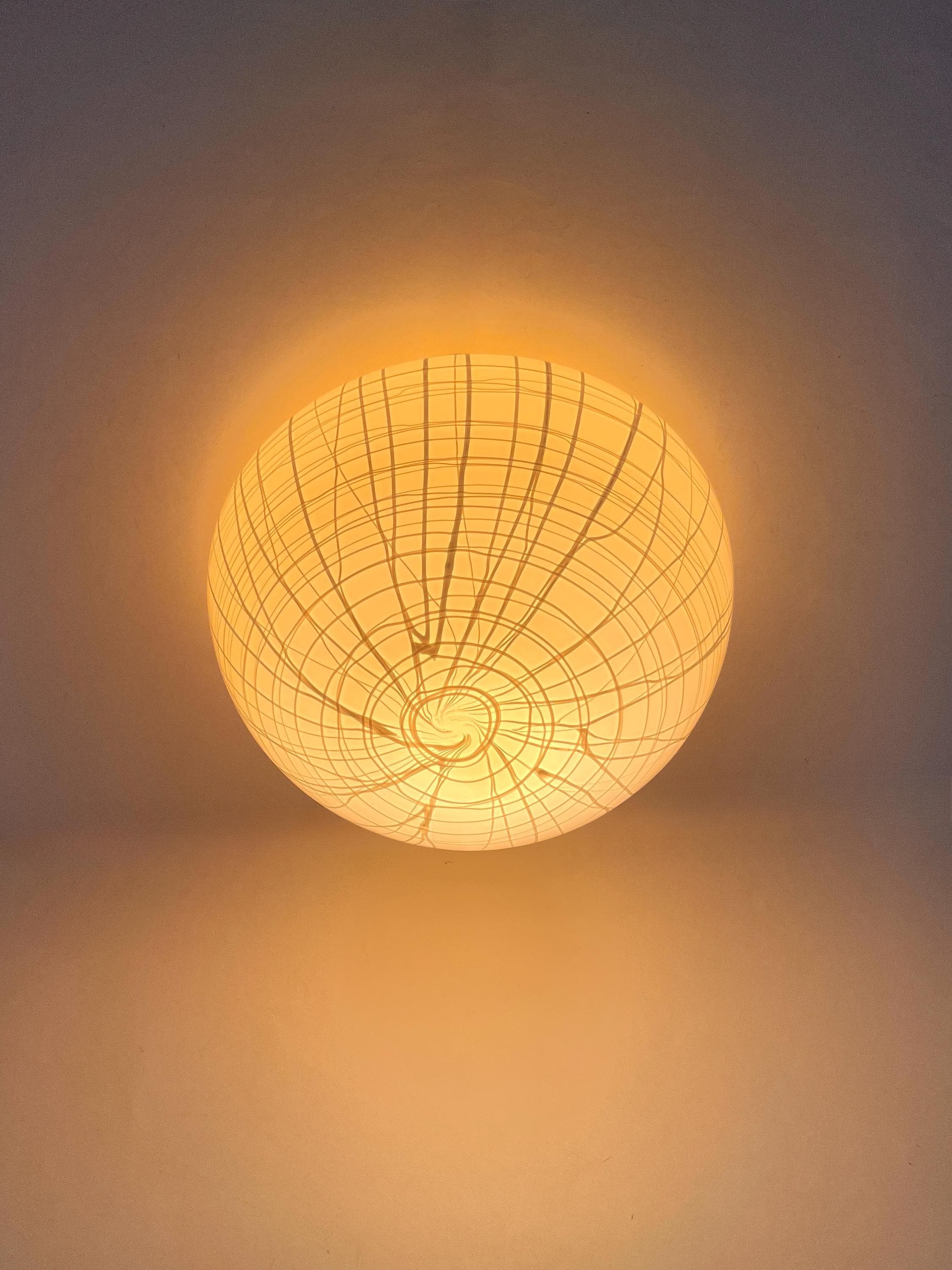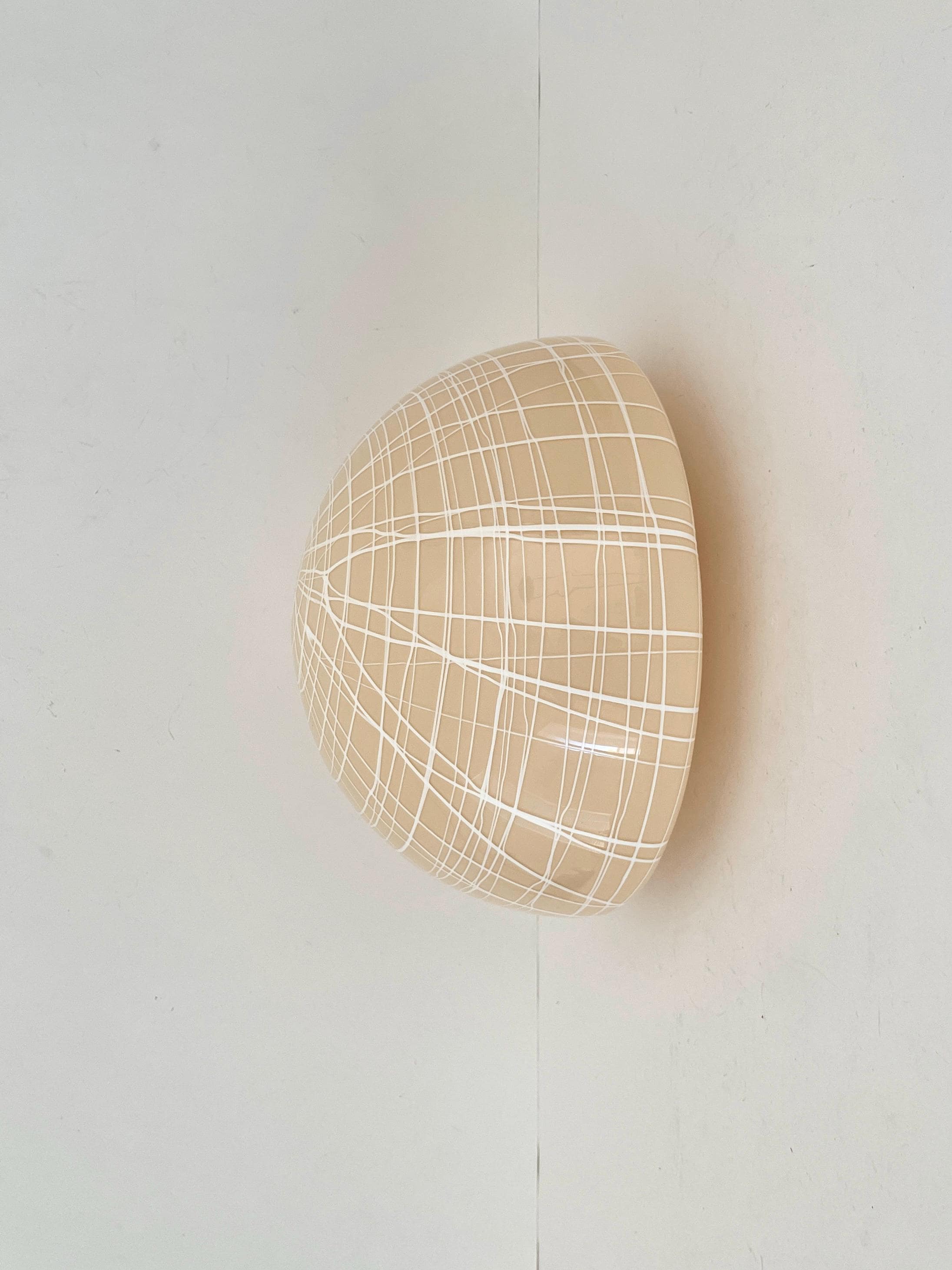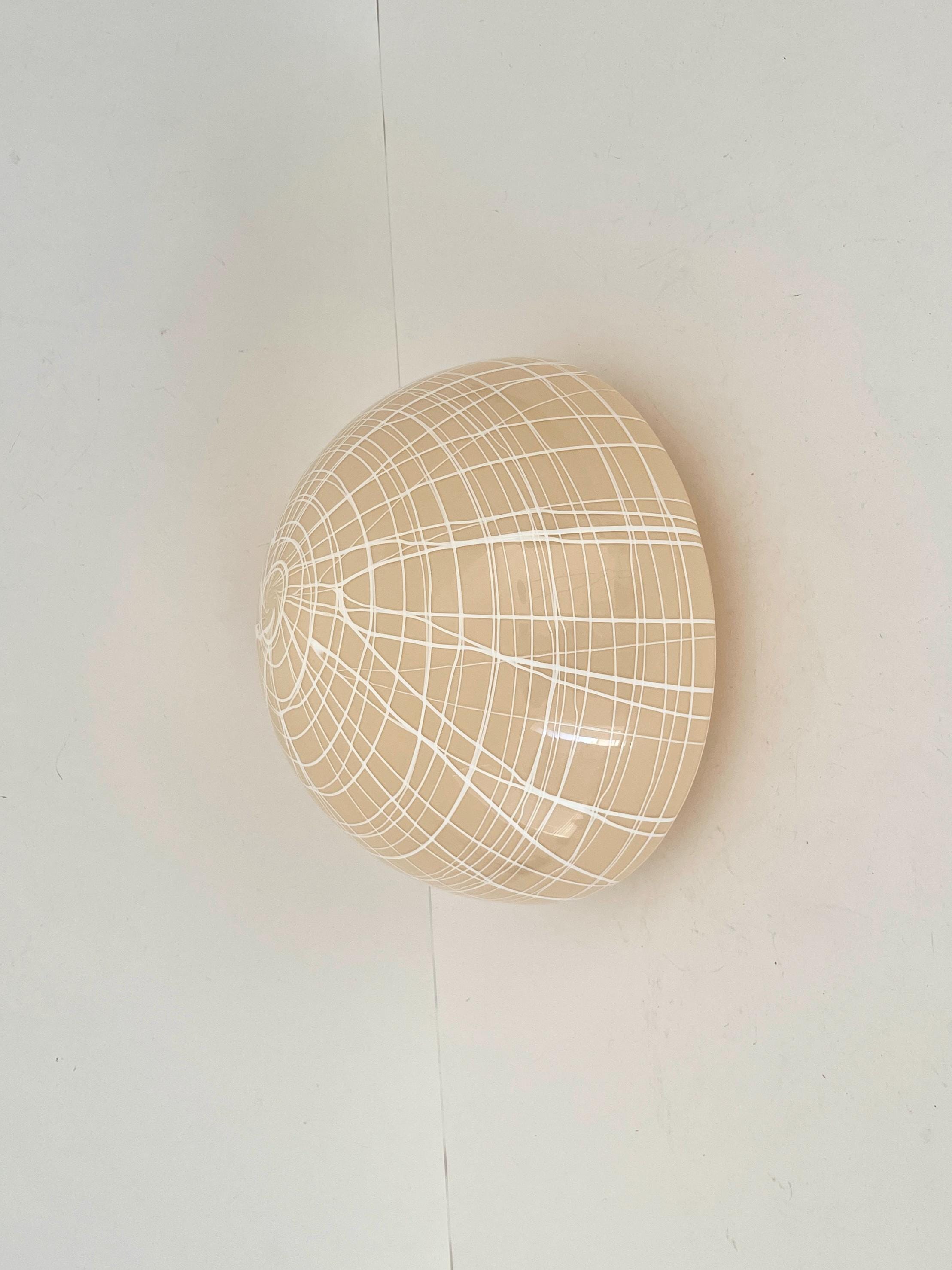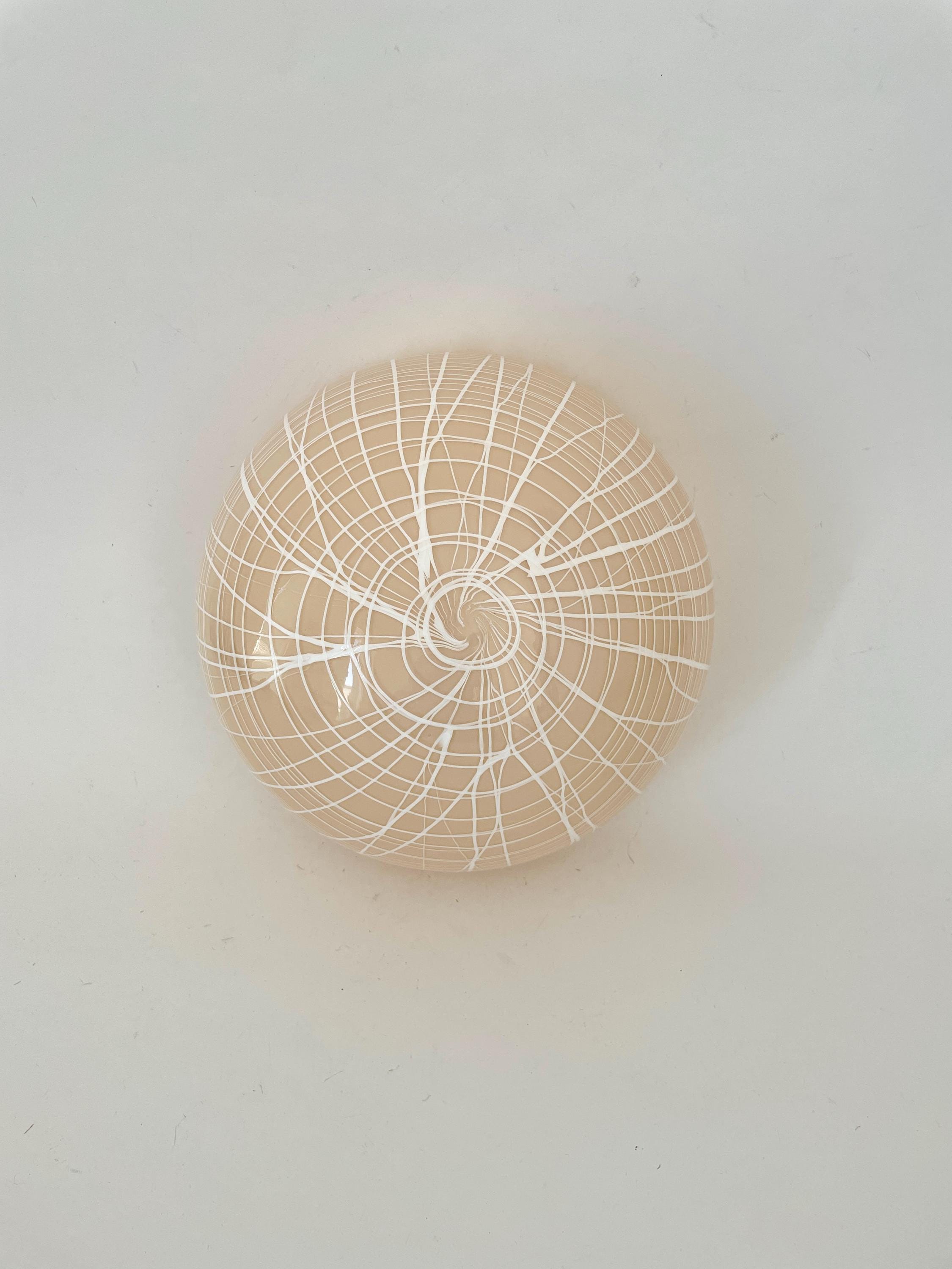 Precious PEONIA wall or ceiling lamp by LA MURRINA Murano, the cased glass has a refined cream-colored background tone and a white filigree on the surface, the master glassmaker has created each piece by mouth-blowing the glass and then working it while hot with a thin casting of white threads, creating an elegant surface texture that will make it unique, each lamp is different even if similar.