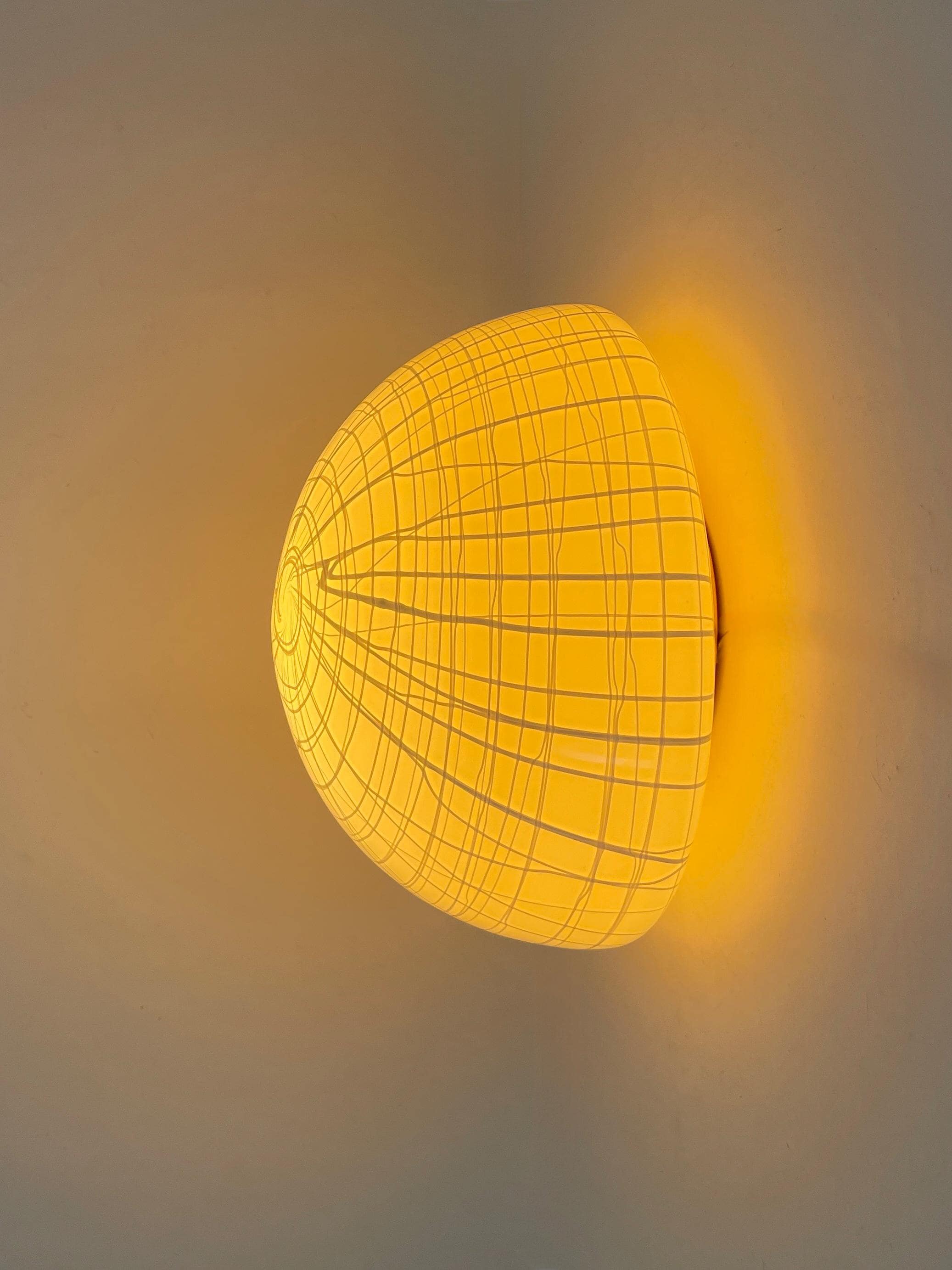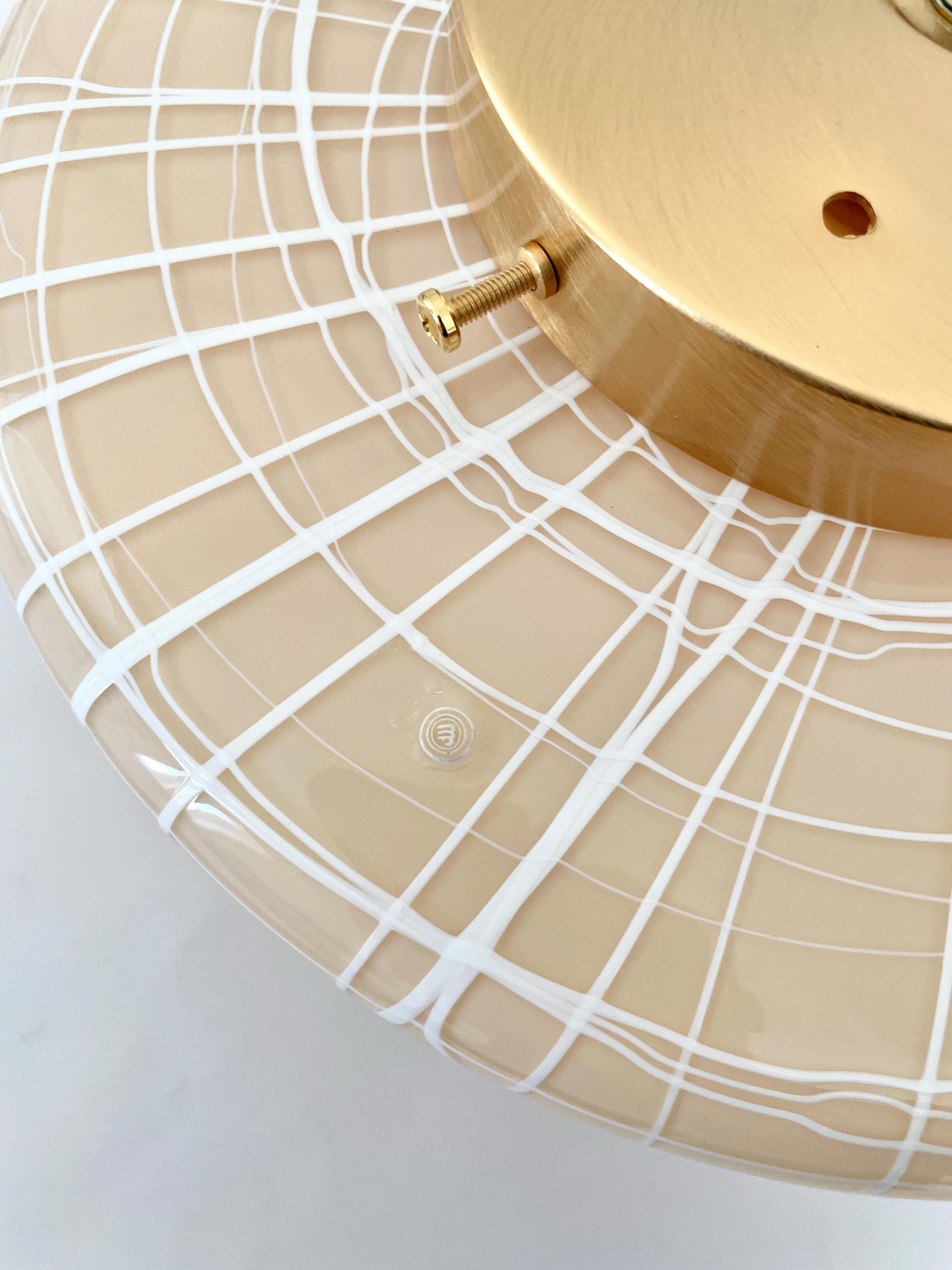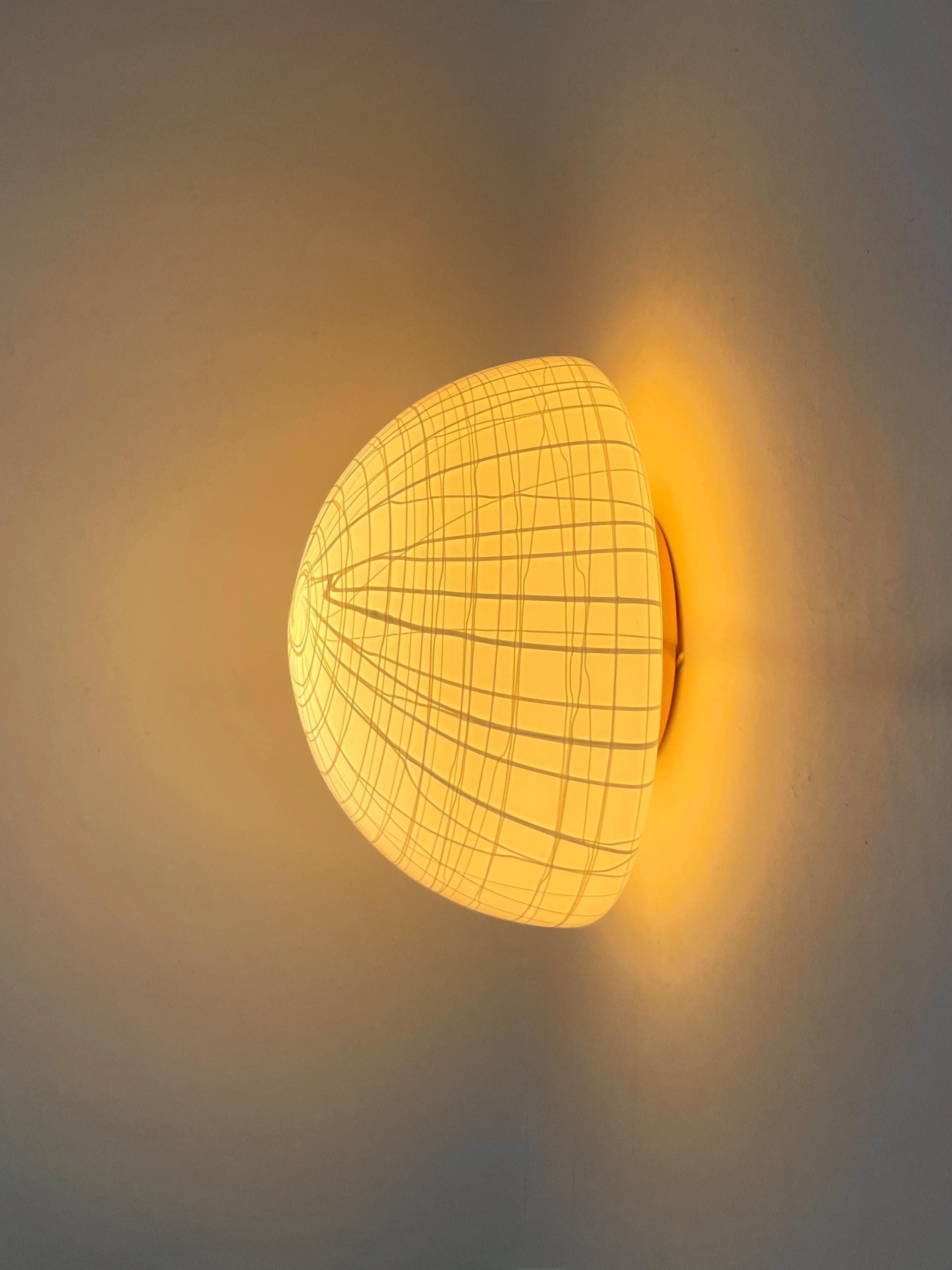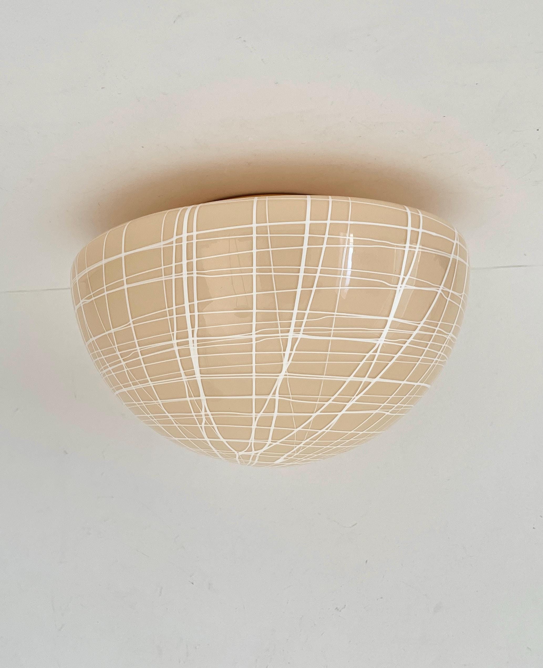 Precious PEONIA wall or ceiling lamp by LA MURRINA Murano, the cased glass has a refined cream-colored background tone and a white filigree on the surface, the master glassmaker has created each piece by mouth-blowing the glass and then working it while hot with a thin casting of white threads, creating an elegant surface texture that will make it unique, each lamp is different even if similar.