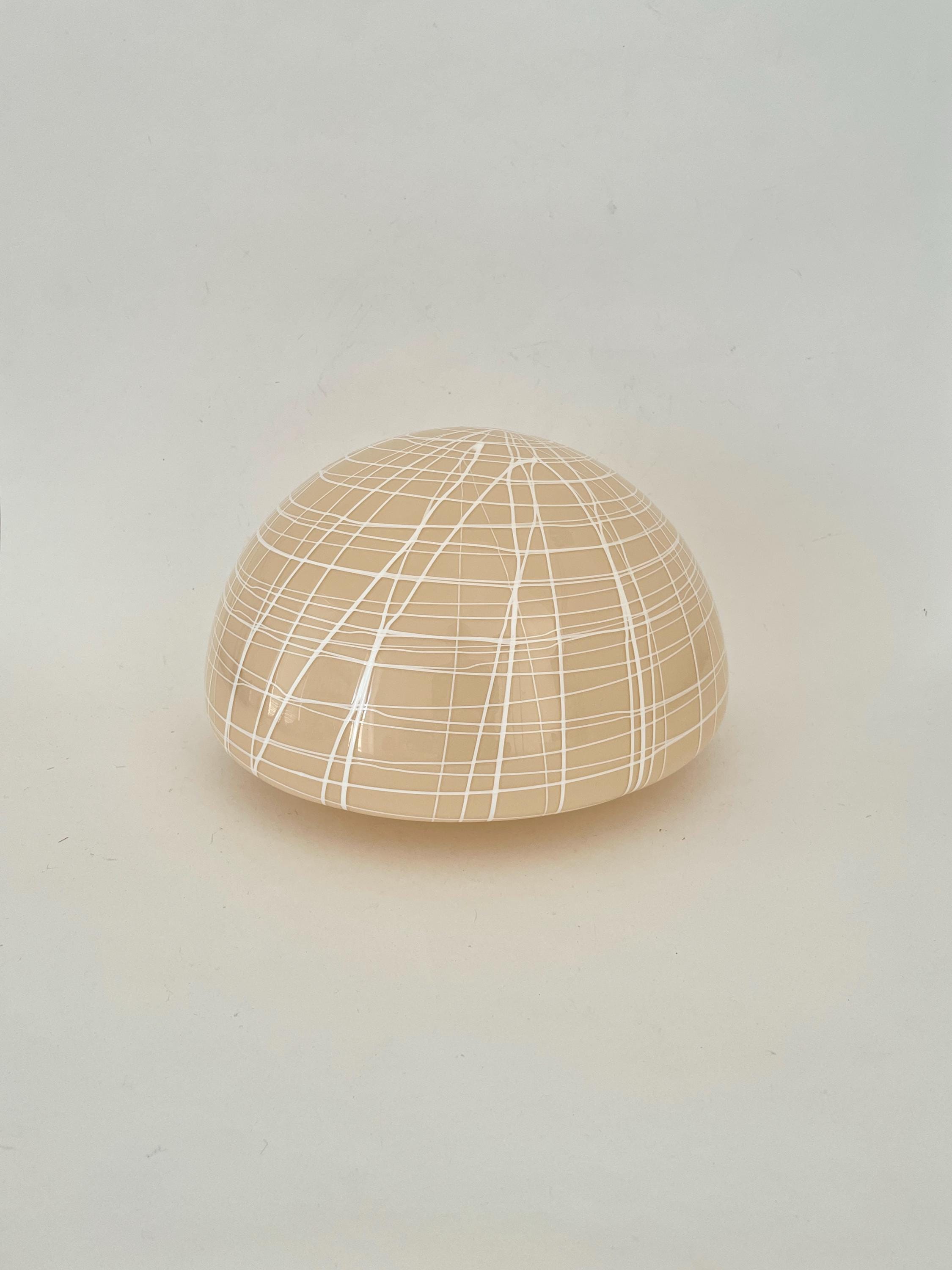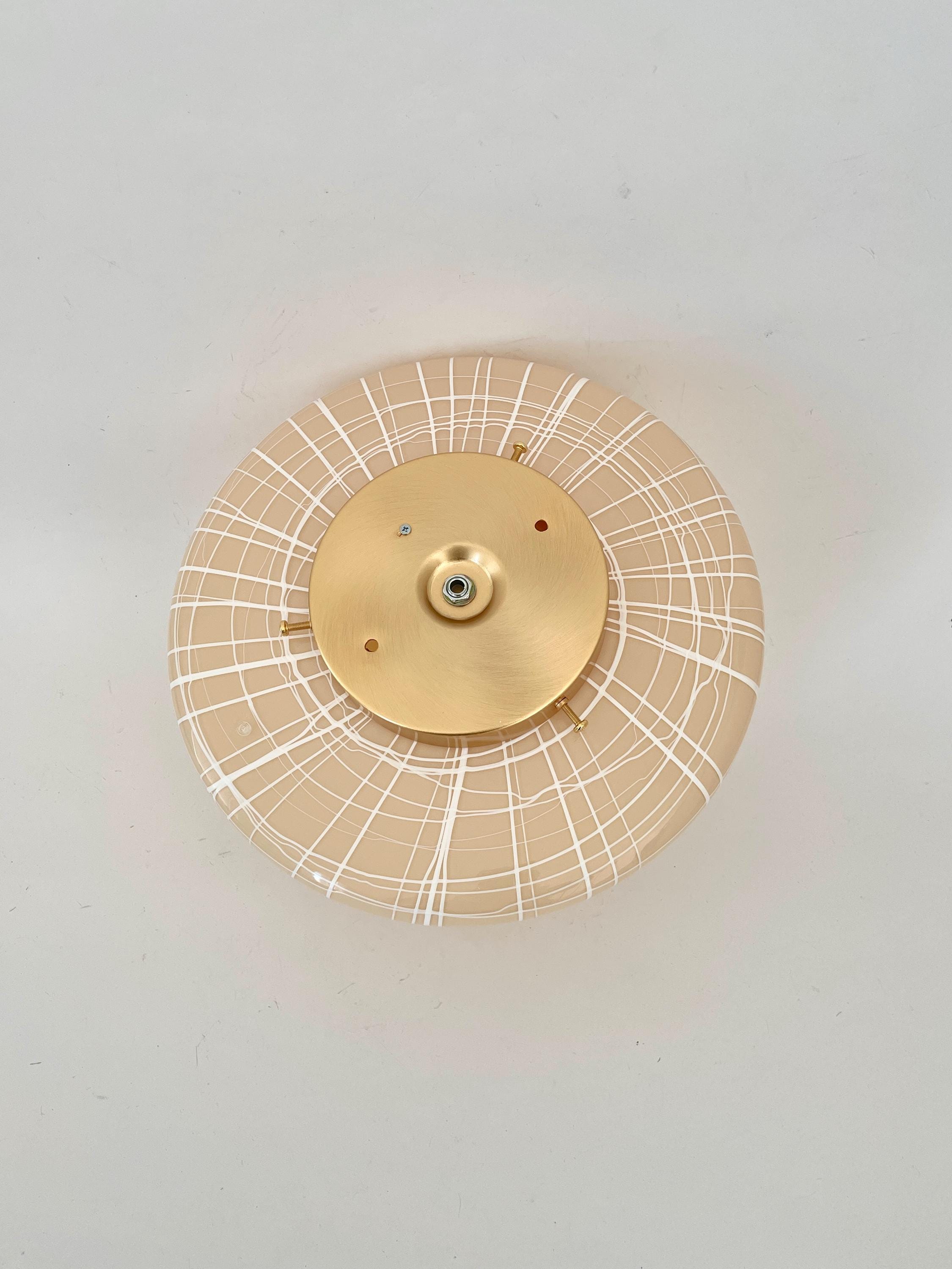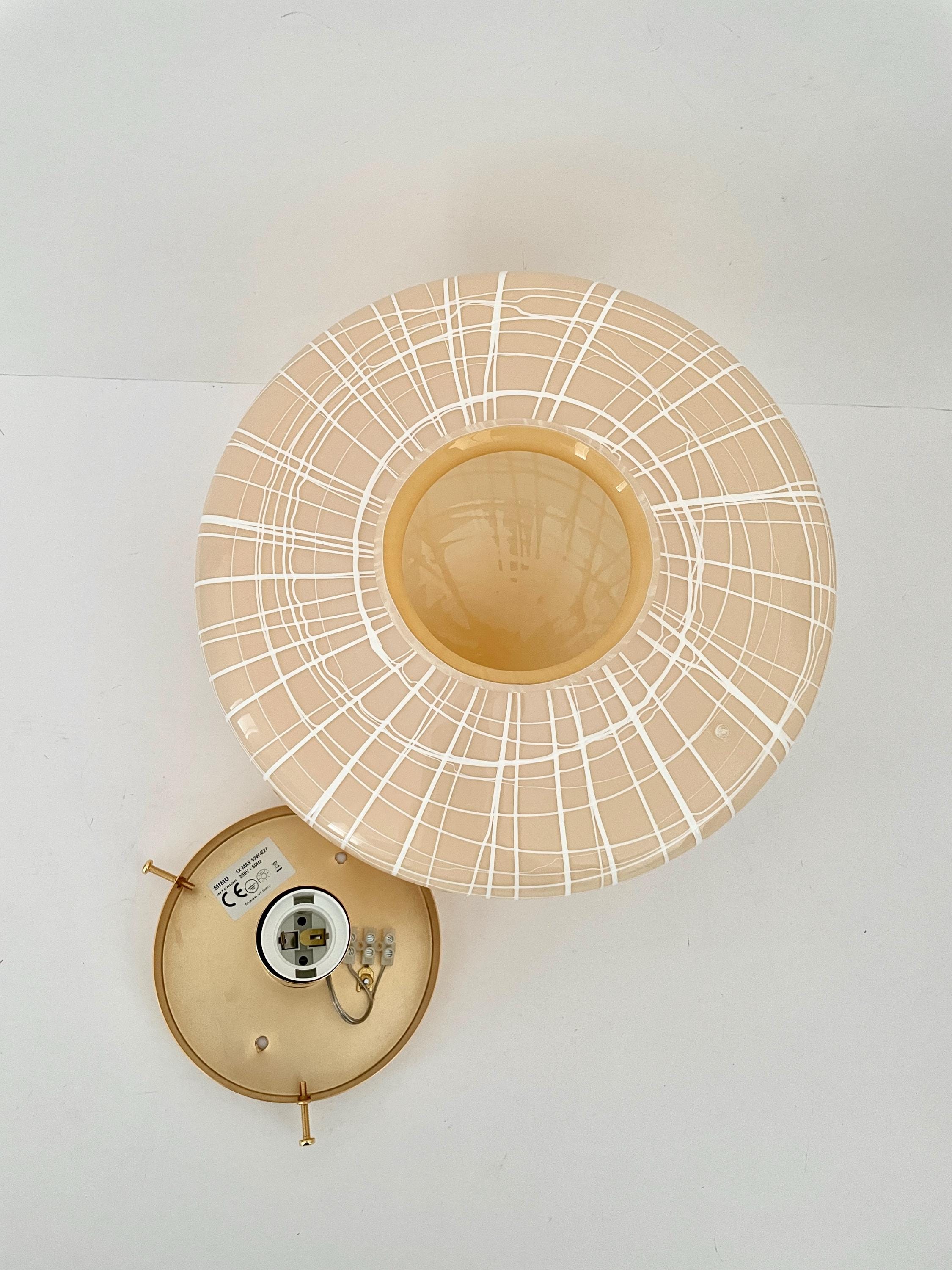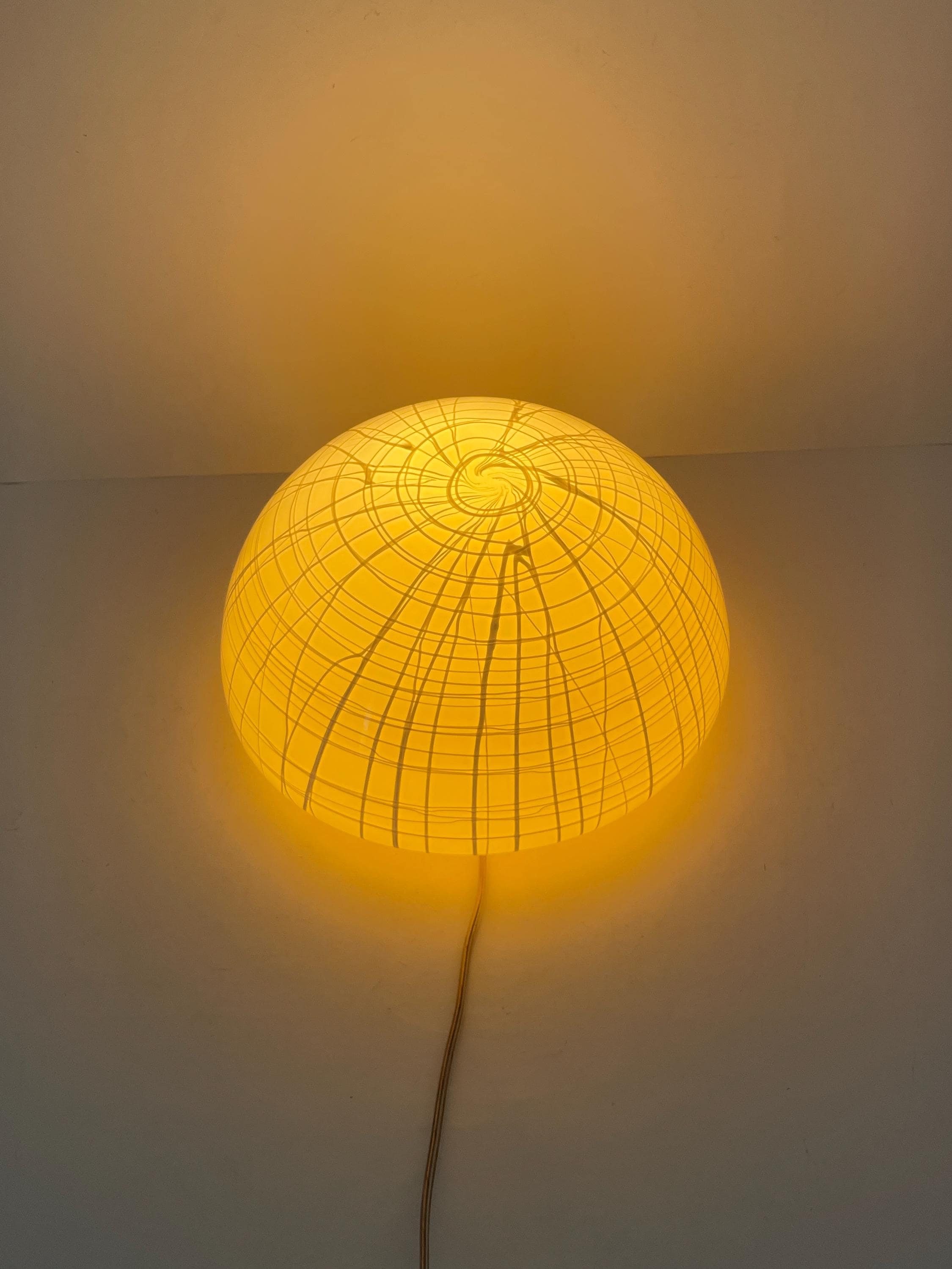 Precious PEONIA wall or ceiling lamp by LA MURRINA Murano, the cased glass has a refined cream-colored background tone and a white filigree on the surface, the master glassmaker has created each piece by mouth-blowing the glass and then working it while hot with a thin casting of white threads, creating an elegant surface texture that will make it unique, each lamp is different even if similar.