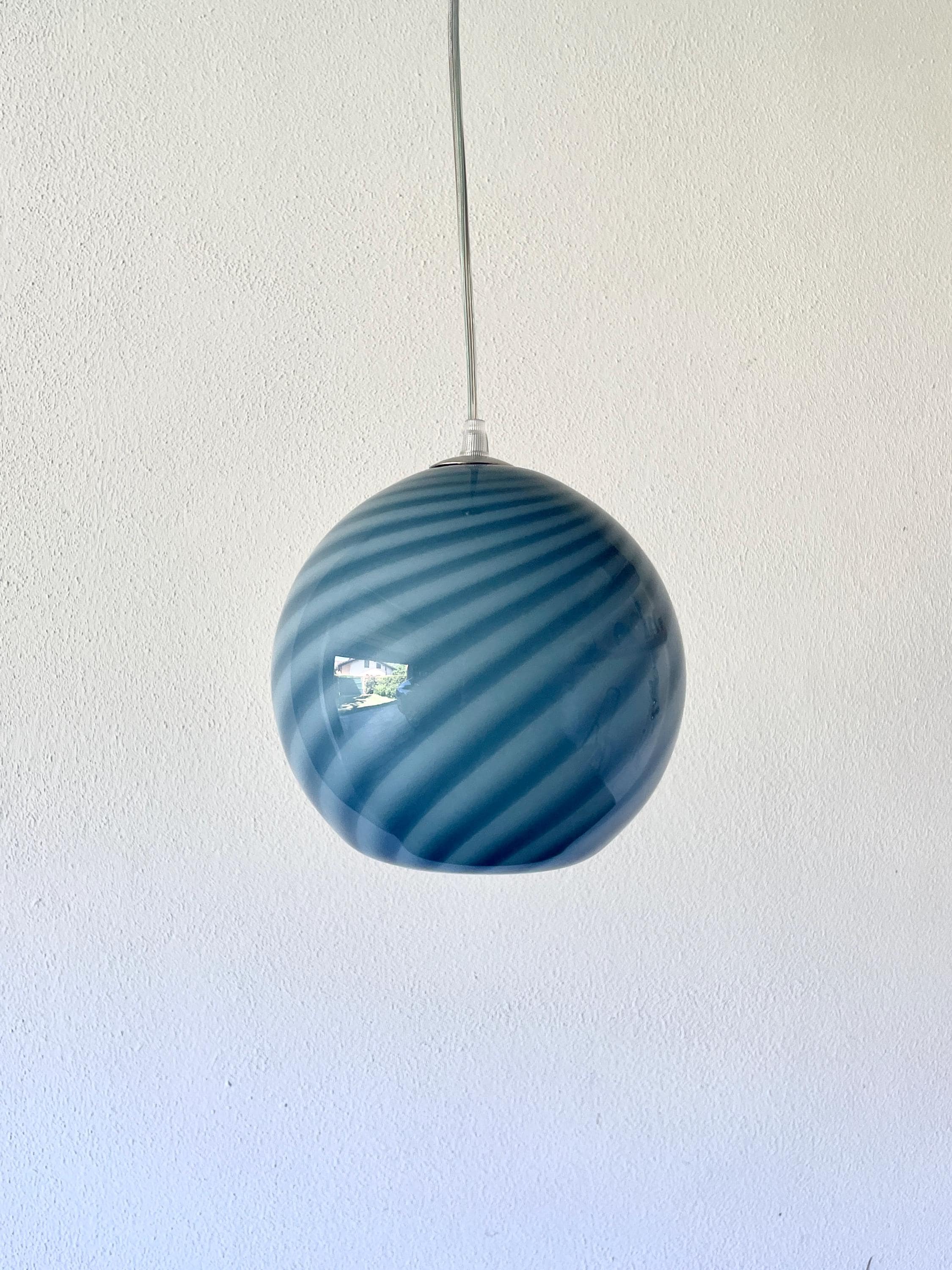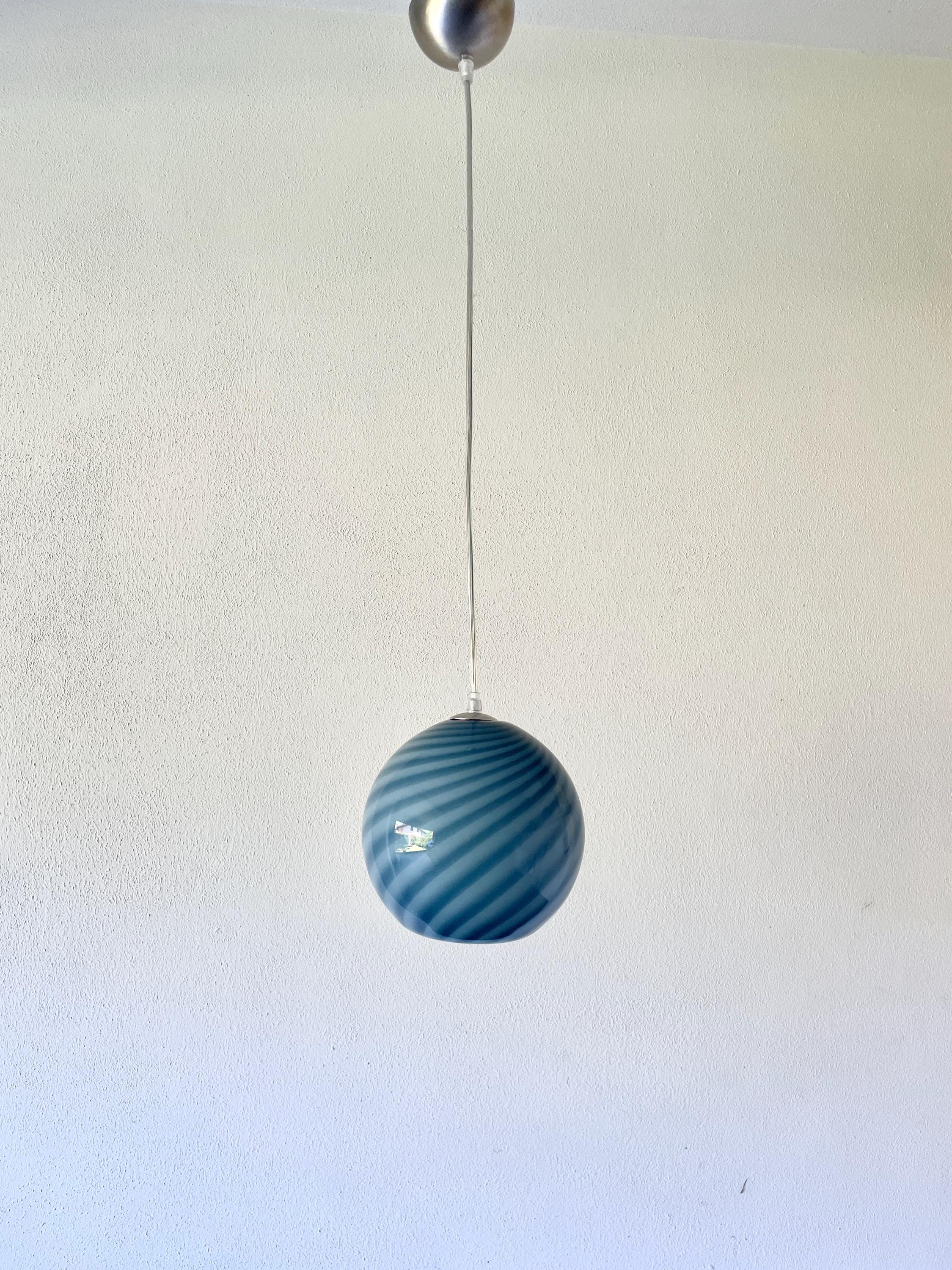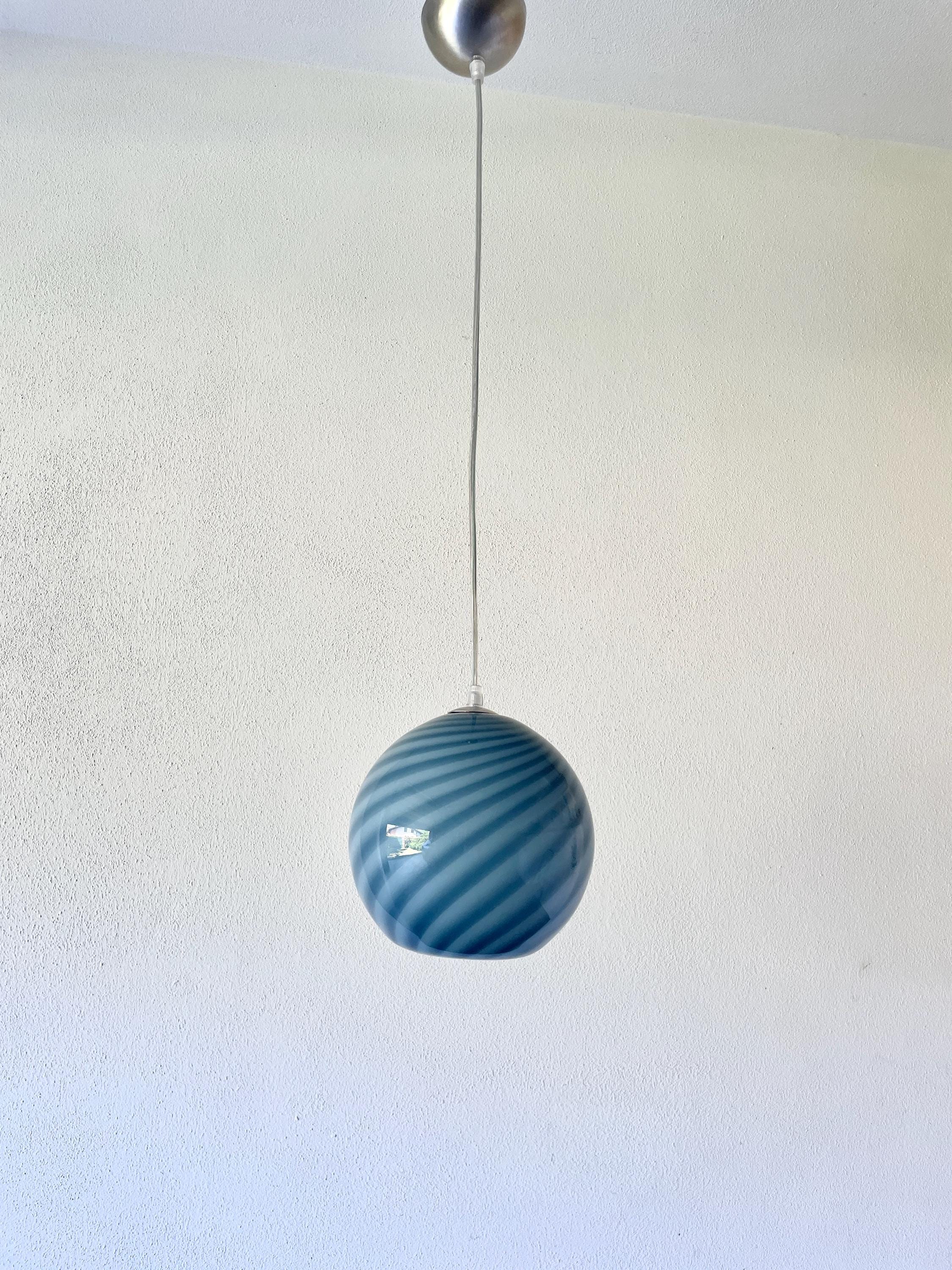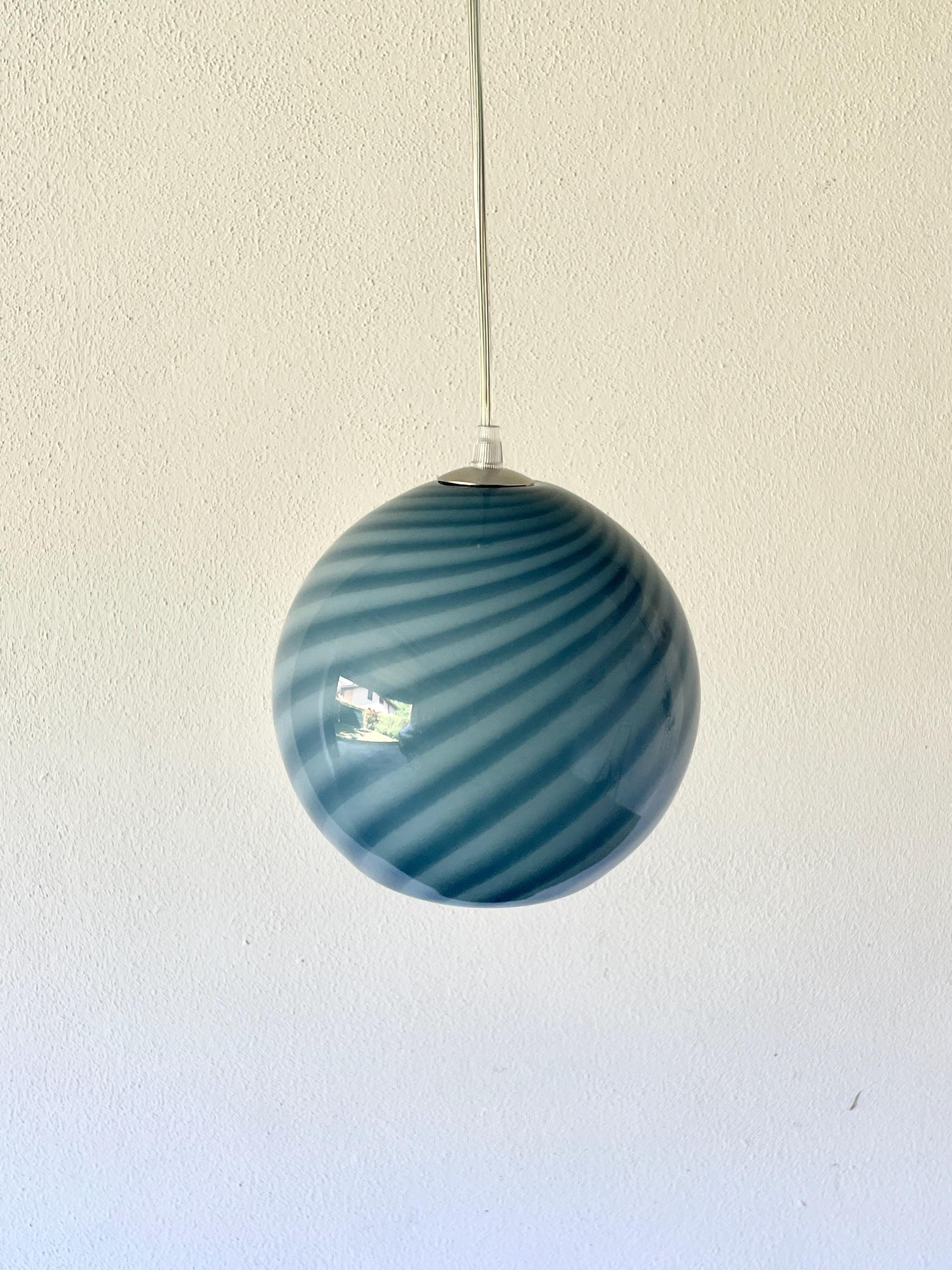 Splendido lampadario, vintage anni '90, non usato, con bellissimo vetro di Murano, a forma sferica, soffiato a bocca e lavorato a mano dai maestri vetrai di Murano, il metodo è squello sinuoso e raffinato del rigadin ritorto, "swirl", ogni lampada di Murano è unica, sono tutte splendide ma possono essere leggermente diverse da quella fotografata.