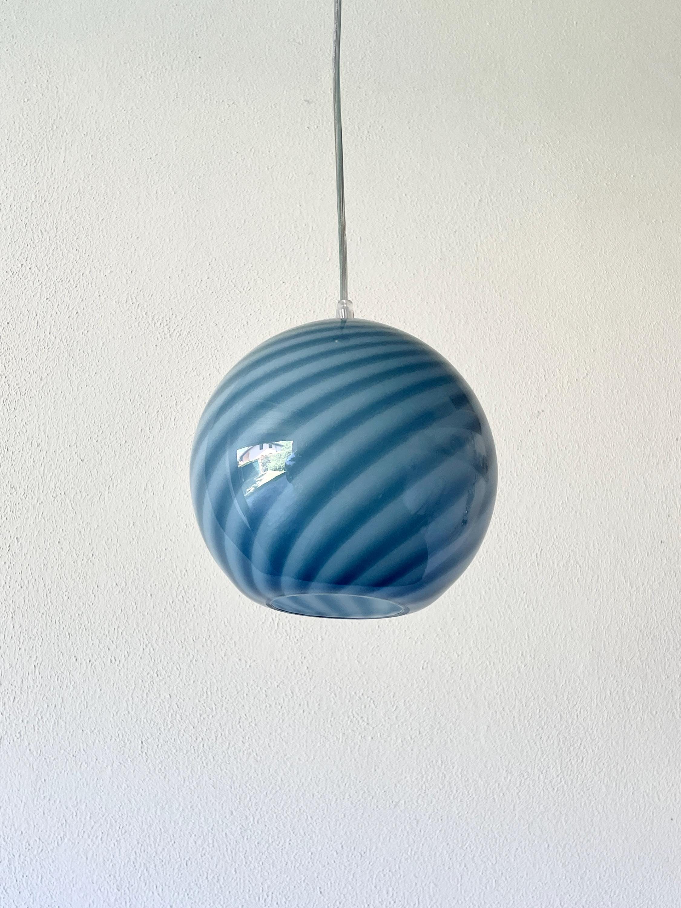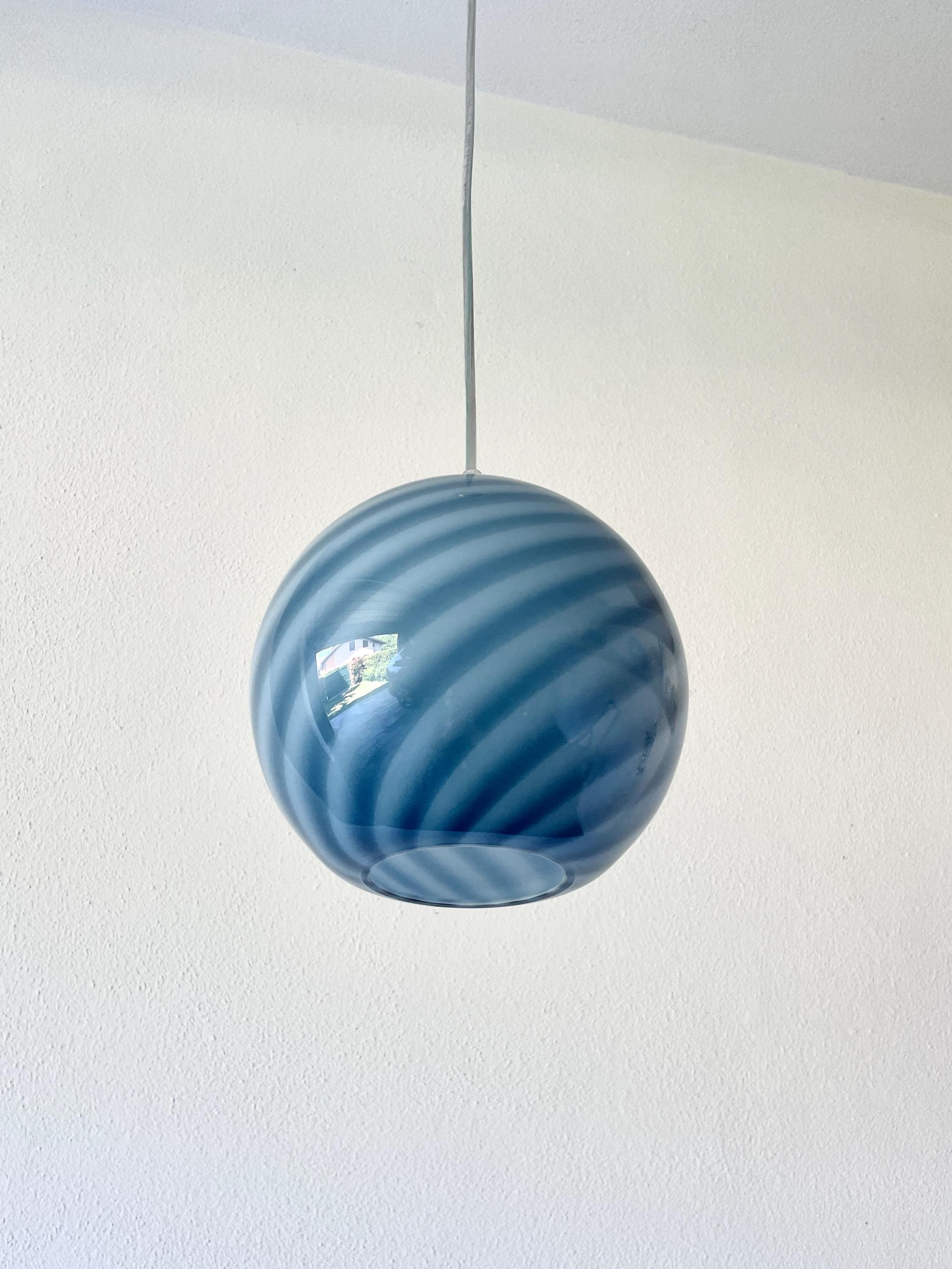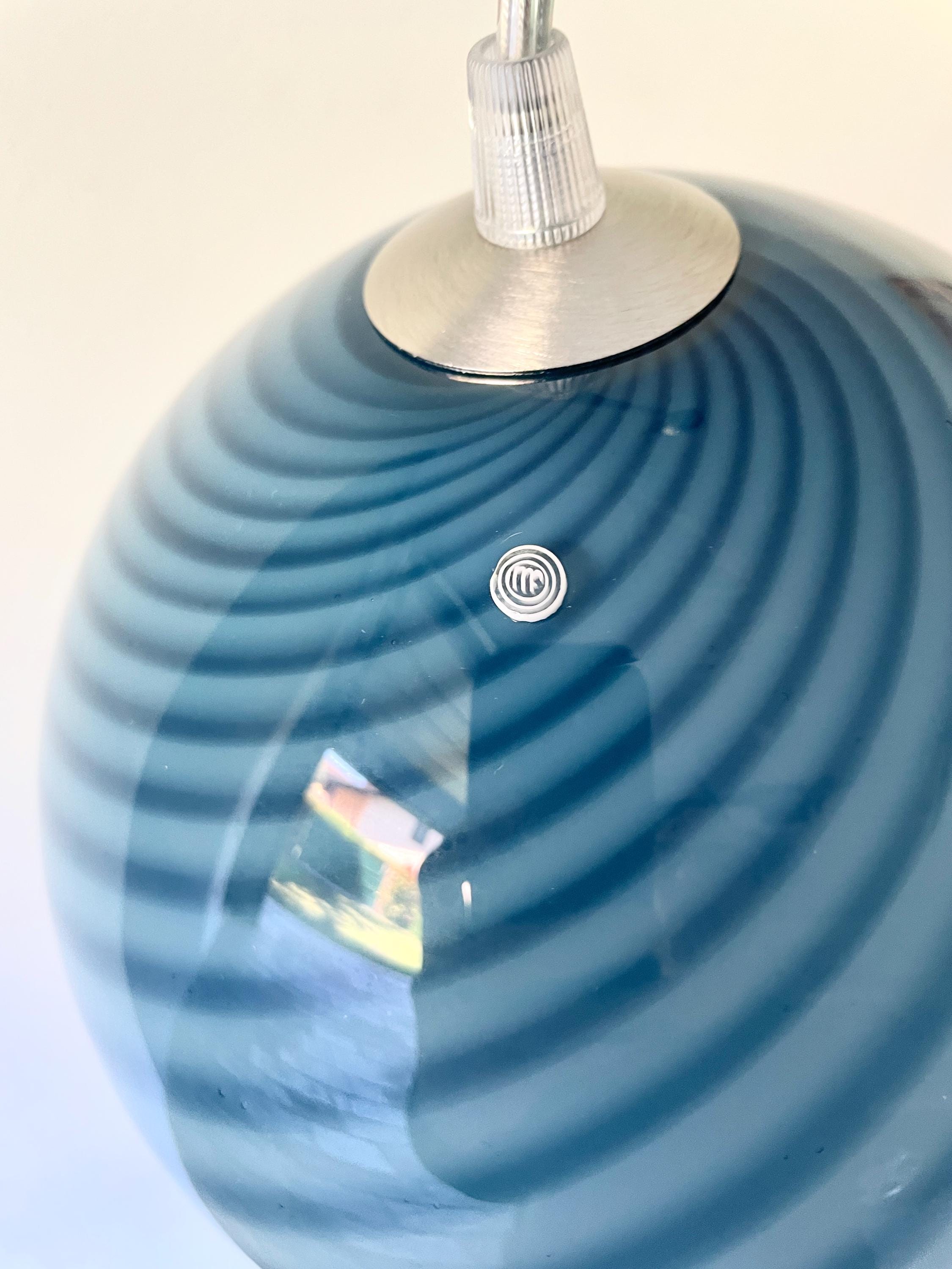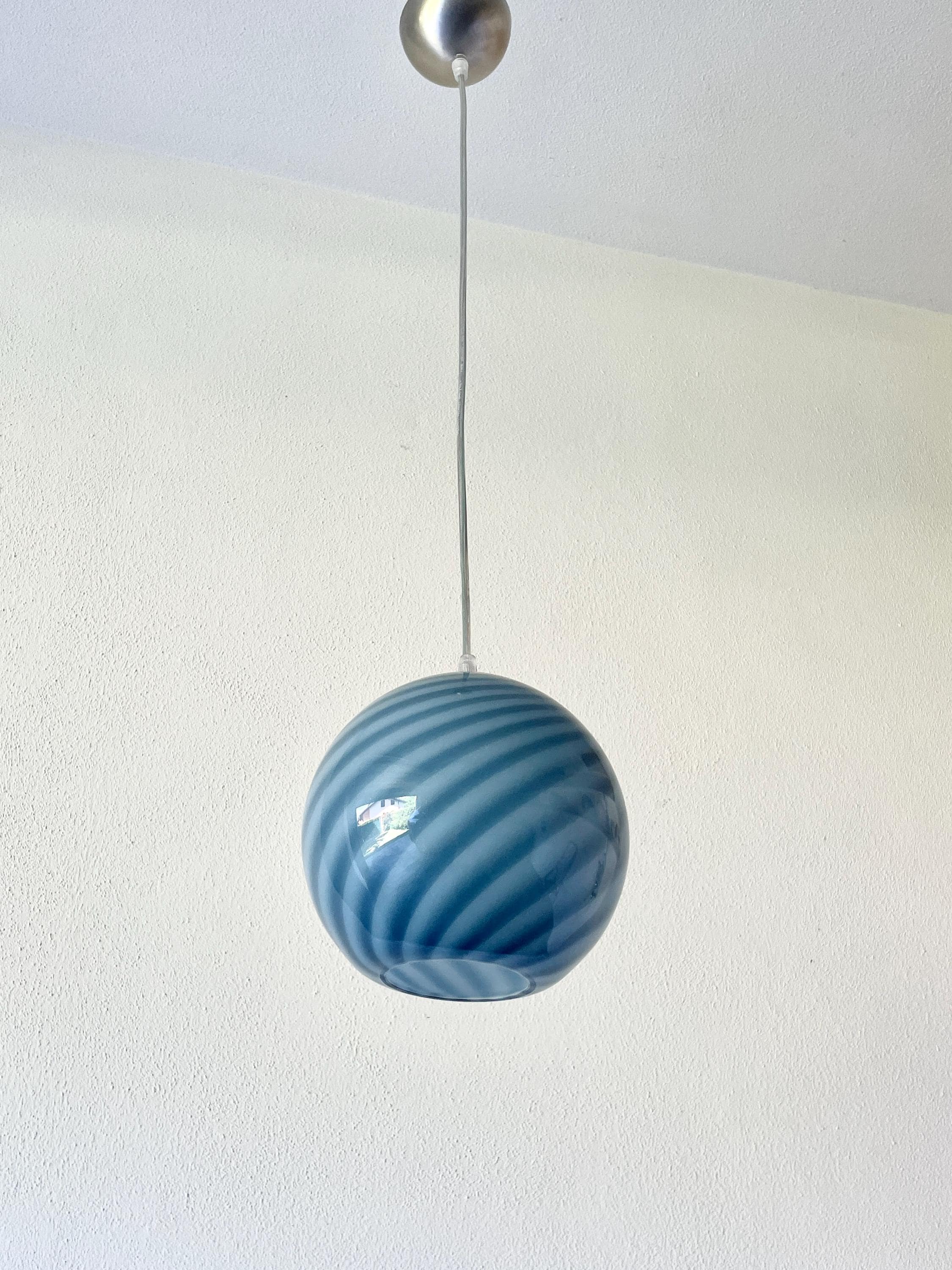 Splendido lampadario, vintage anni '90, non usato, con bellissimo vetro di Murano, a forma sferica, soffiato a bocca e lavorato a mano dai maestri vetrai di Murano, il metodo è squello sinuoso e raffinato del rigadin ritorto, "swirl", ogni lampada di Murano è unica, sono tutte splendide ma possono essere leggermente diverse da quella fotografata.