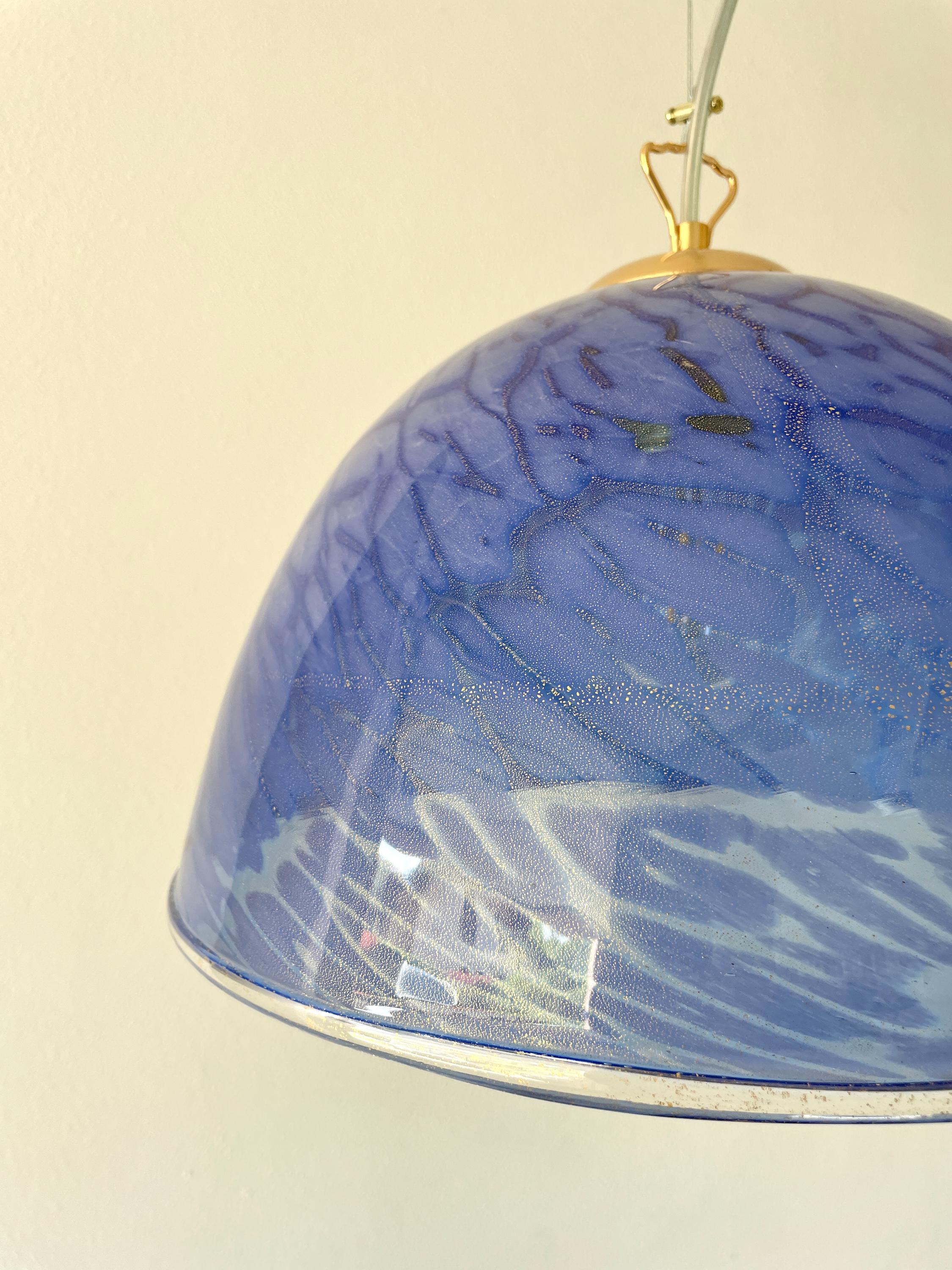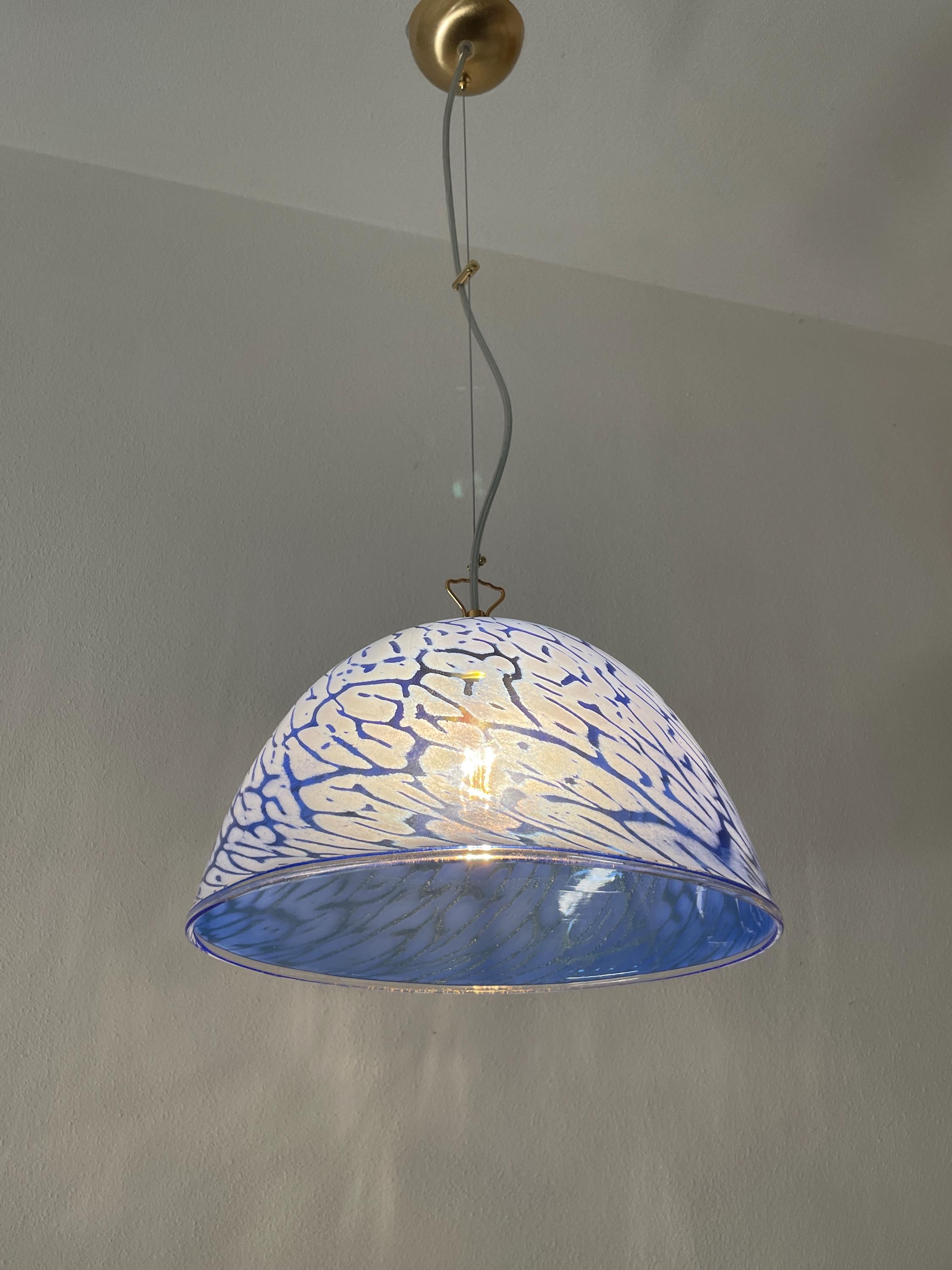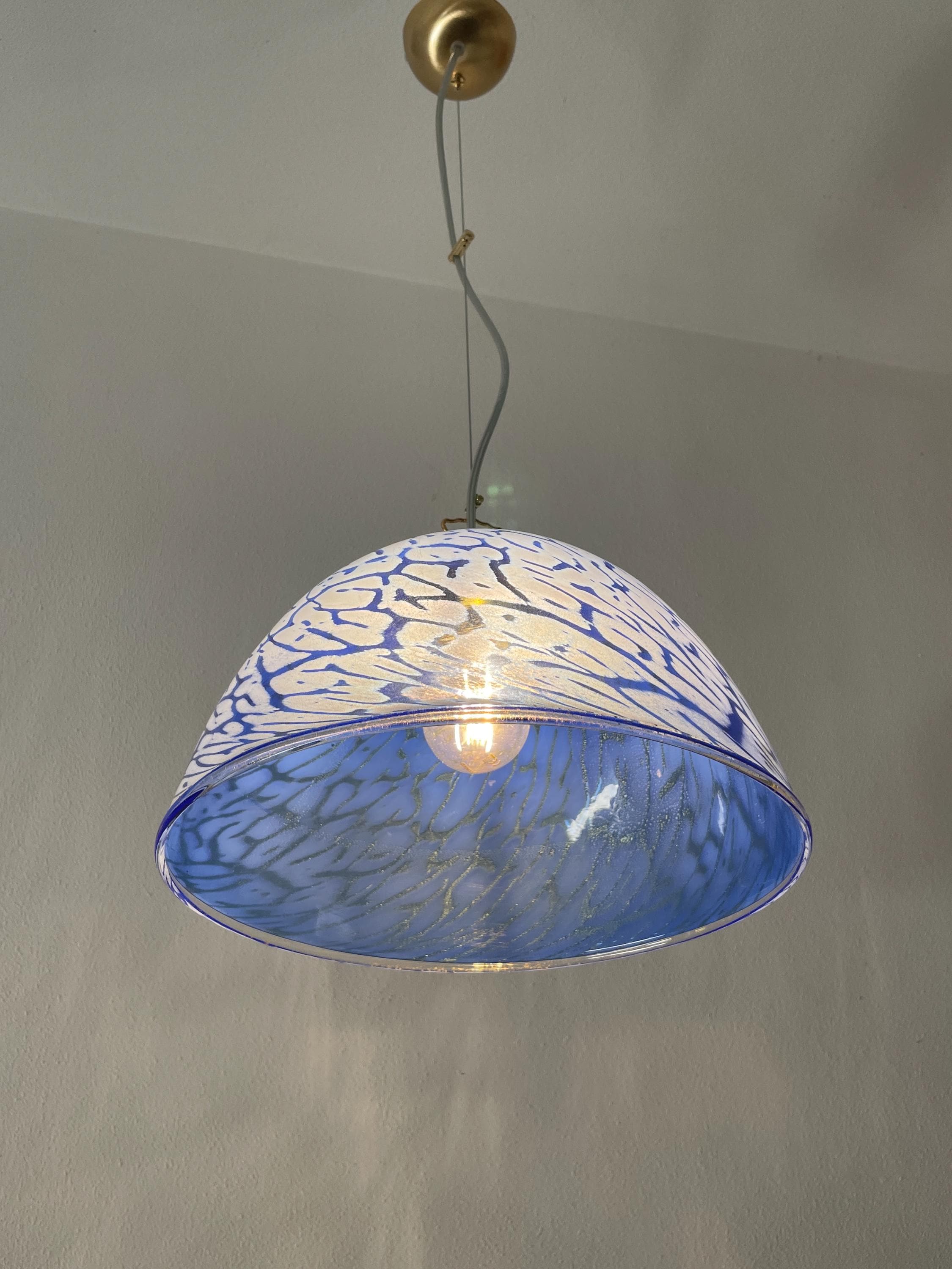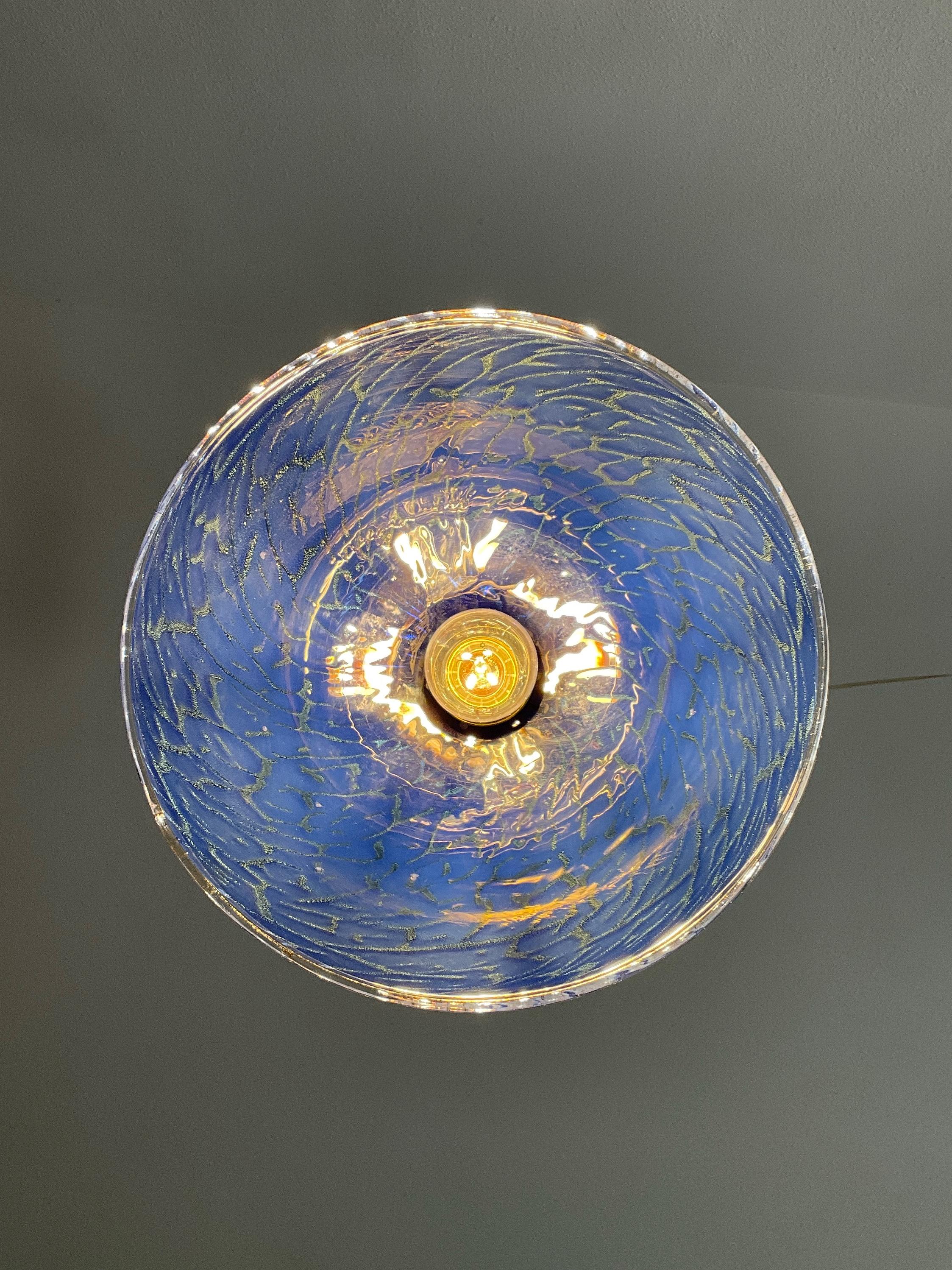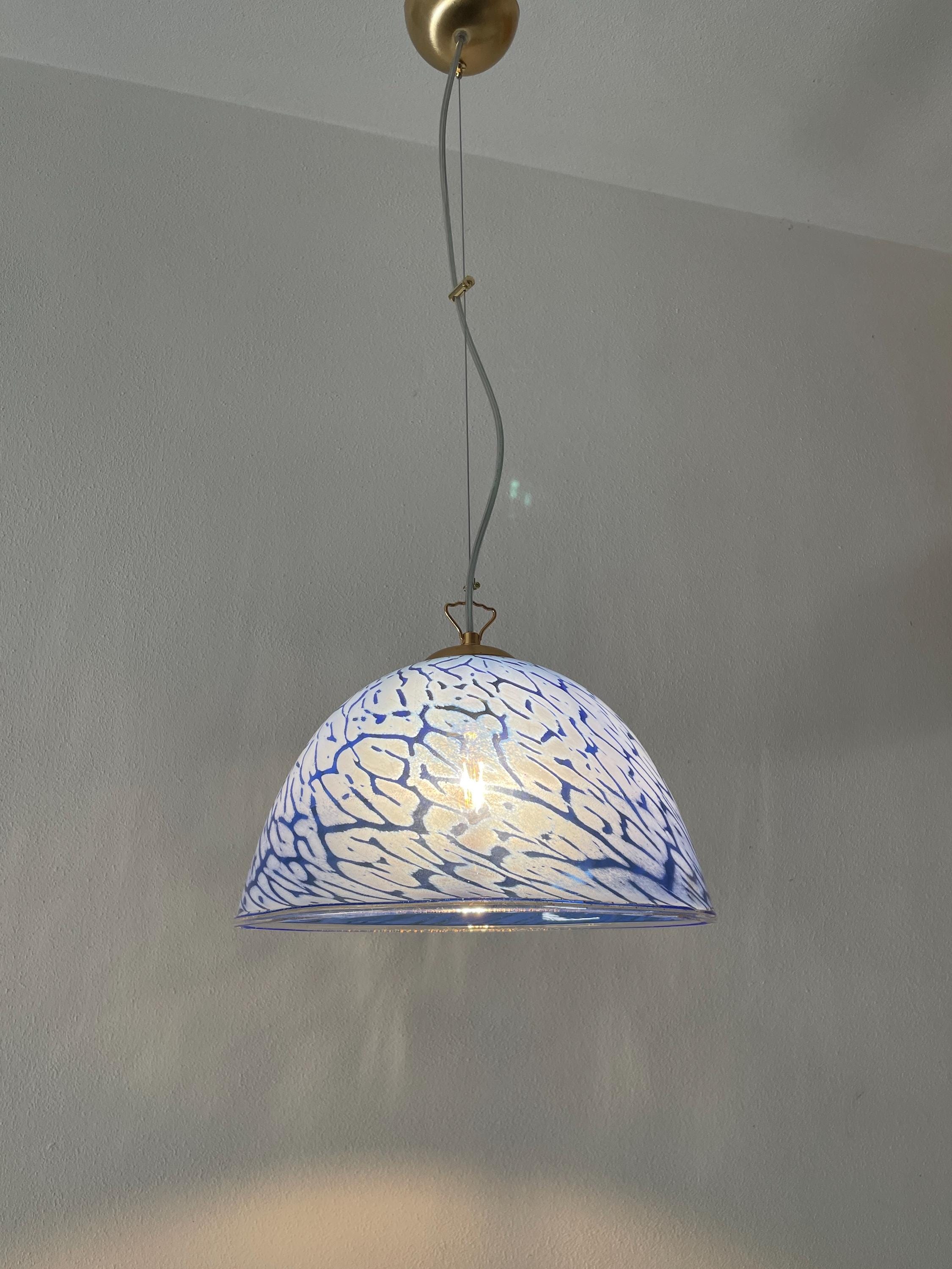 MERLETTI S32 by LA MURRINA is a splendid chandelier, vintage from the 90s, with beautiful Murano glass, mouth-blown and hand-crafted by the master glassmakers of La Murrina, the glass has a beautiful shade of blue with a delicate gold leaf motif, it is embellished with a transparent incalmo on the edge.