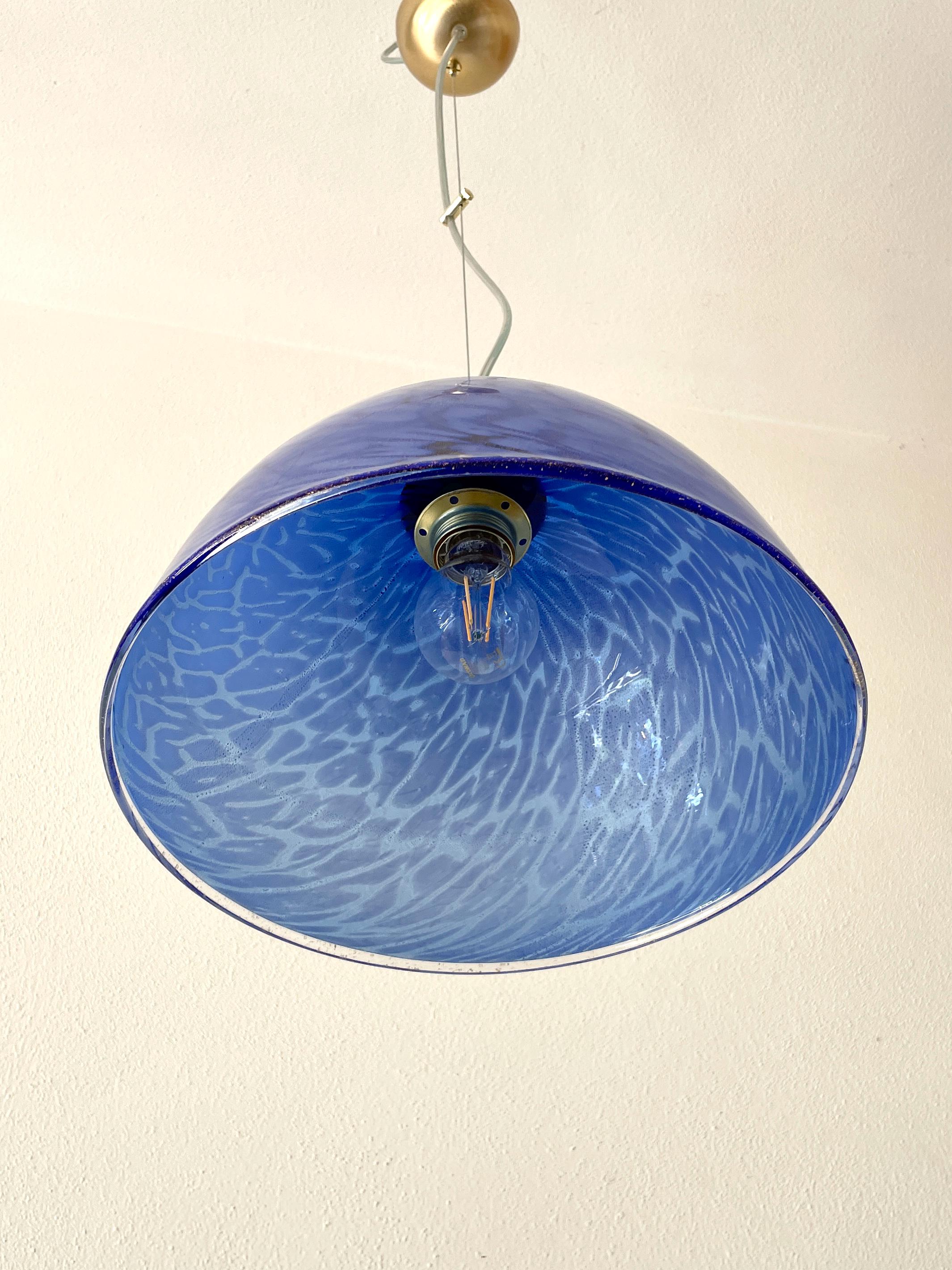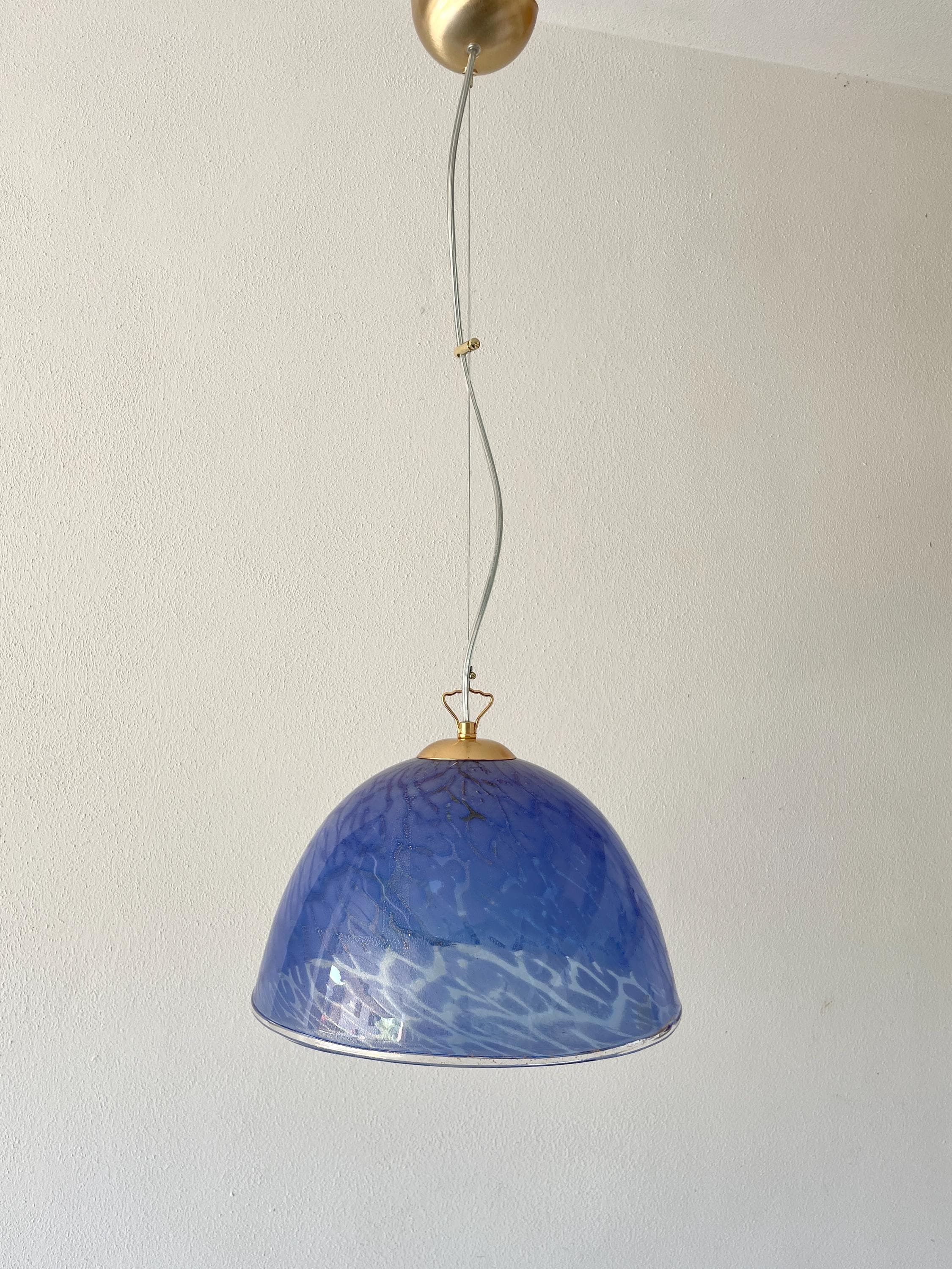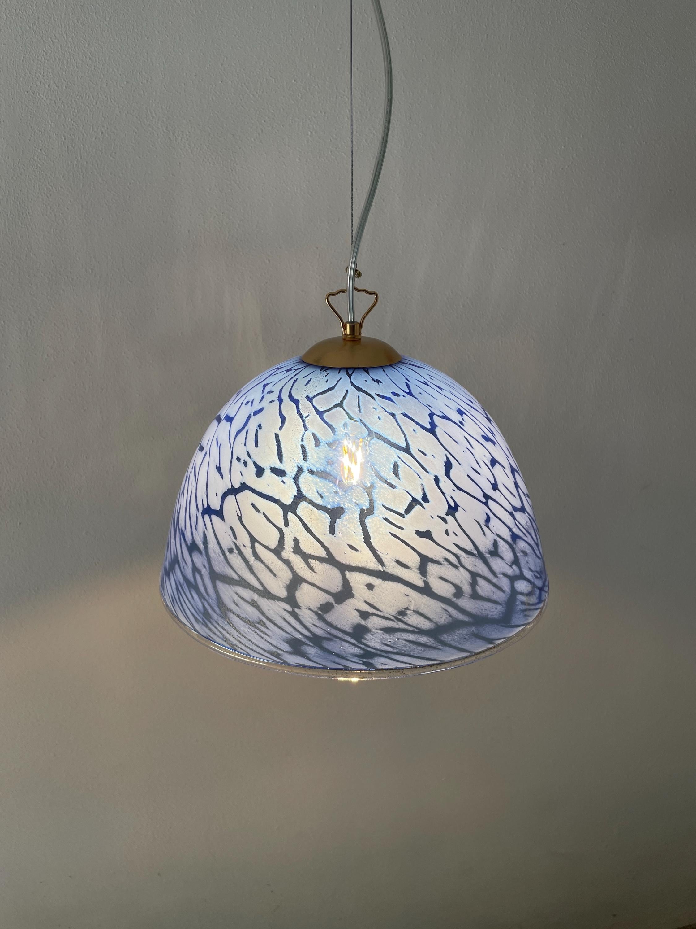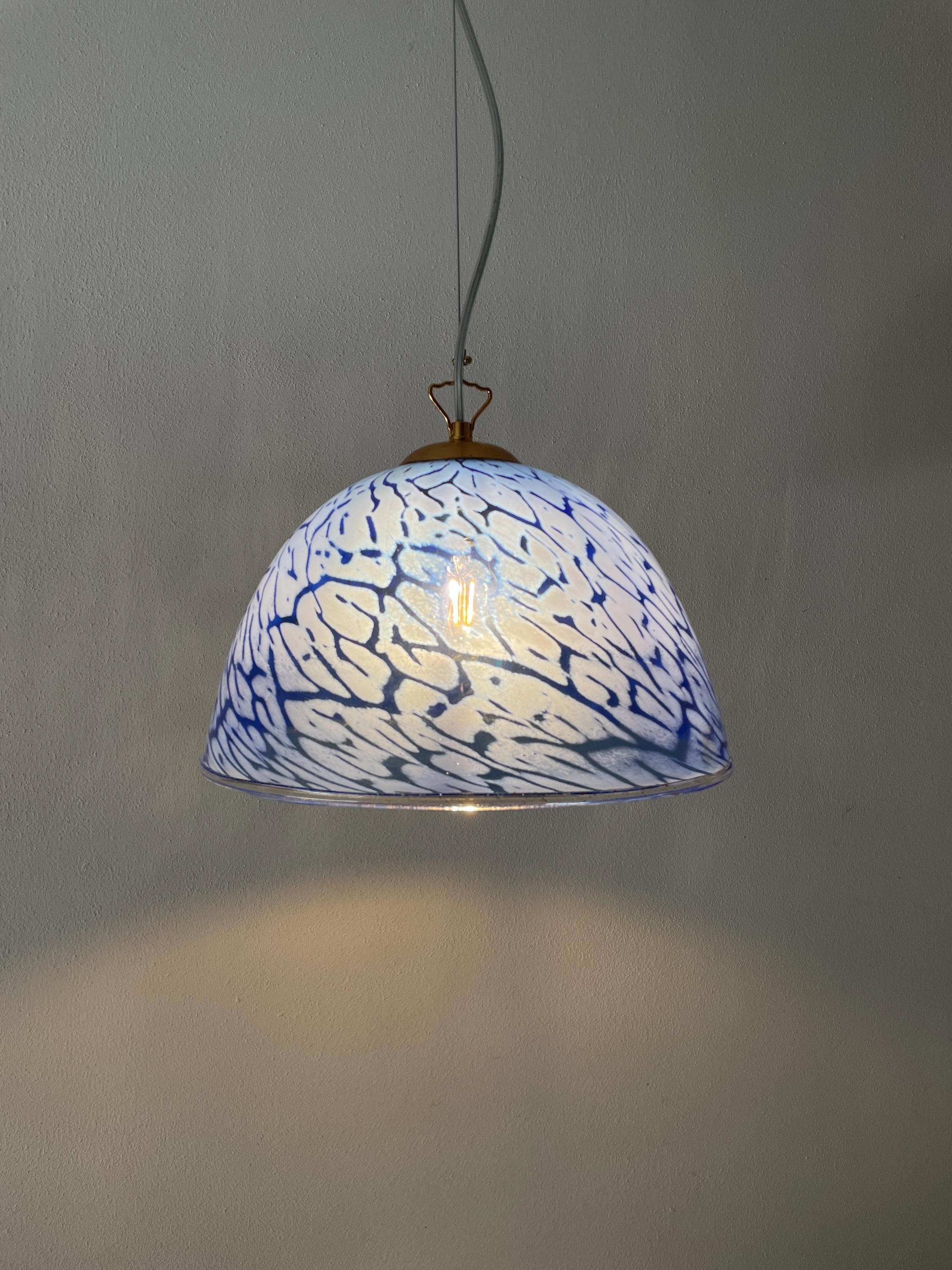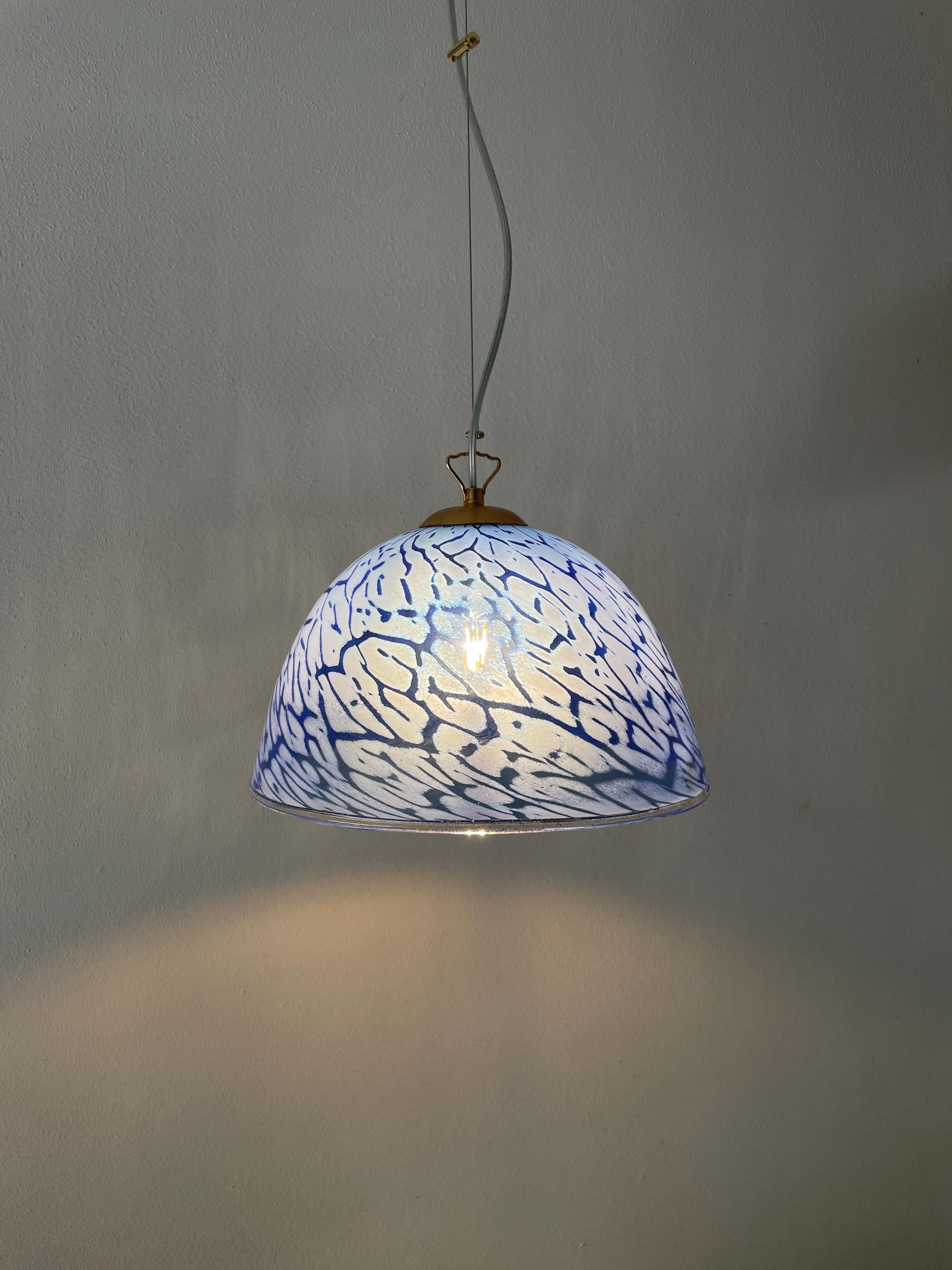 MERLETTI S32 by LA MURRINA is a splendid chandelier, vintage from the 90s, with beautiful Murano glass, mouth-blown and hand-crafted by the master glassmakers of La Murrina, the glass has a beautiful shade of blue with a delicate gold leaf motif, it is embellished with a transparent incalmo on the edge.