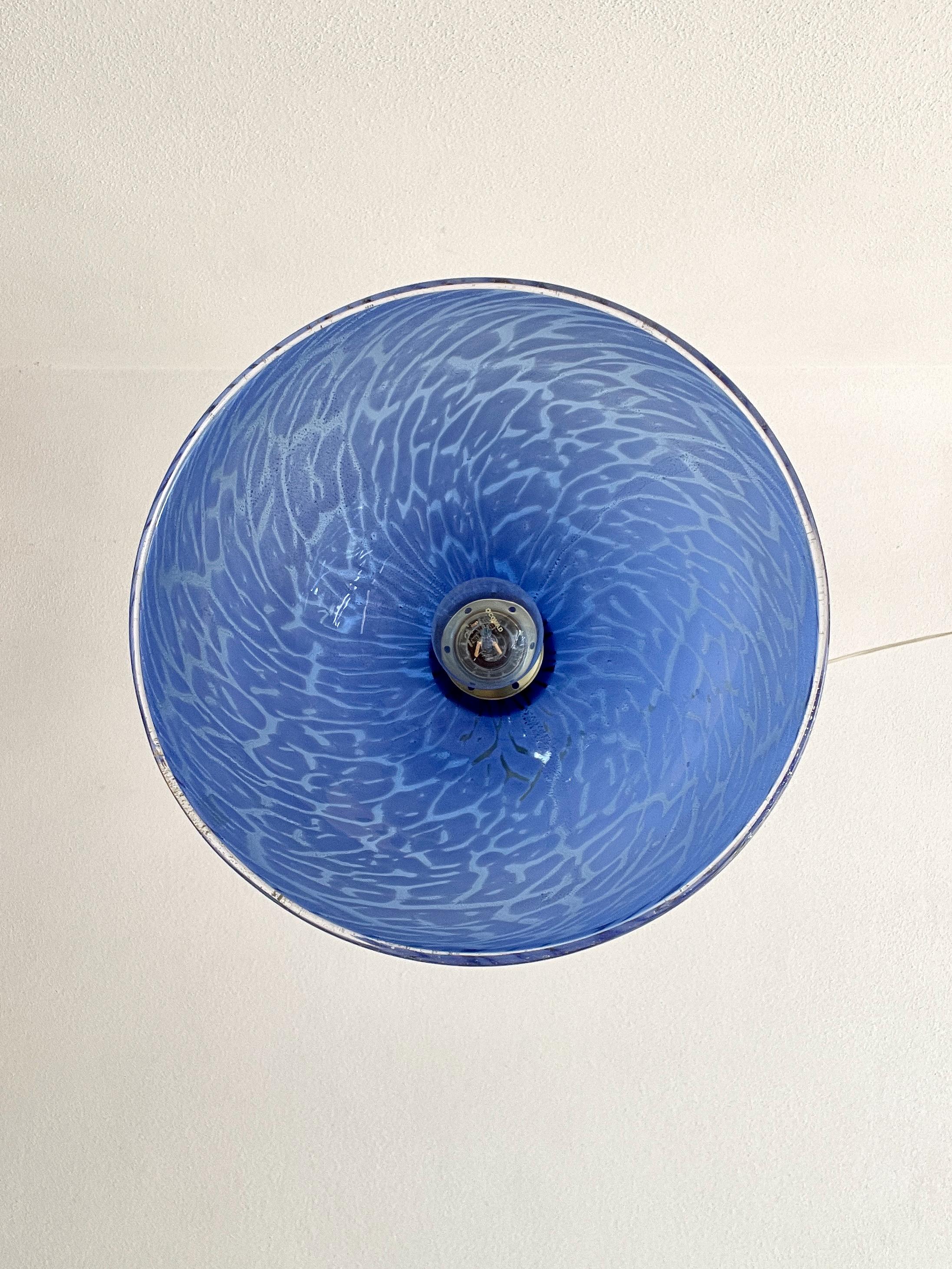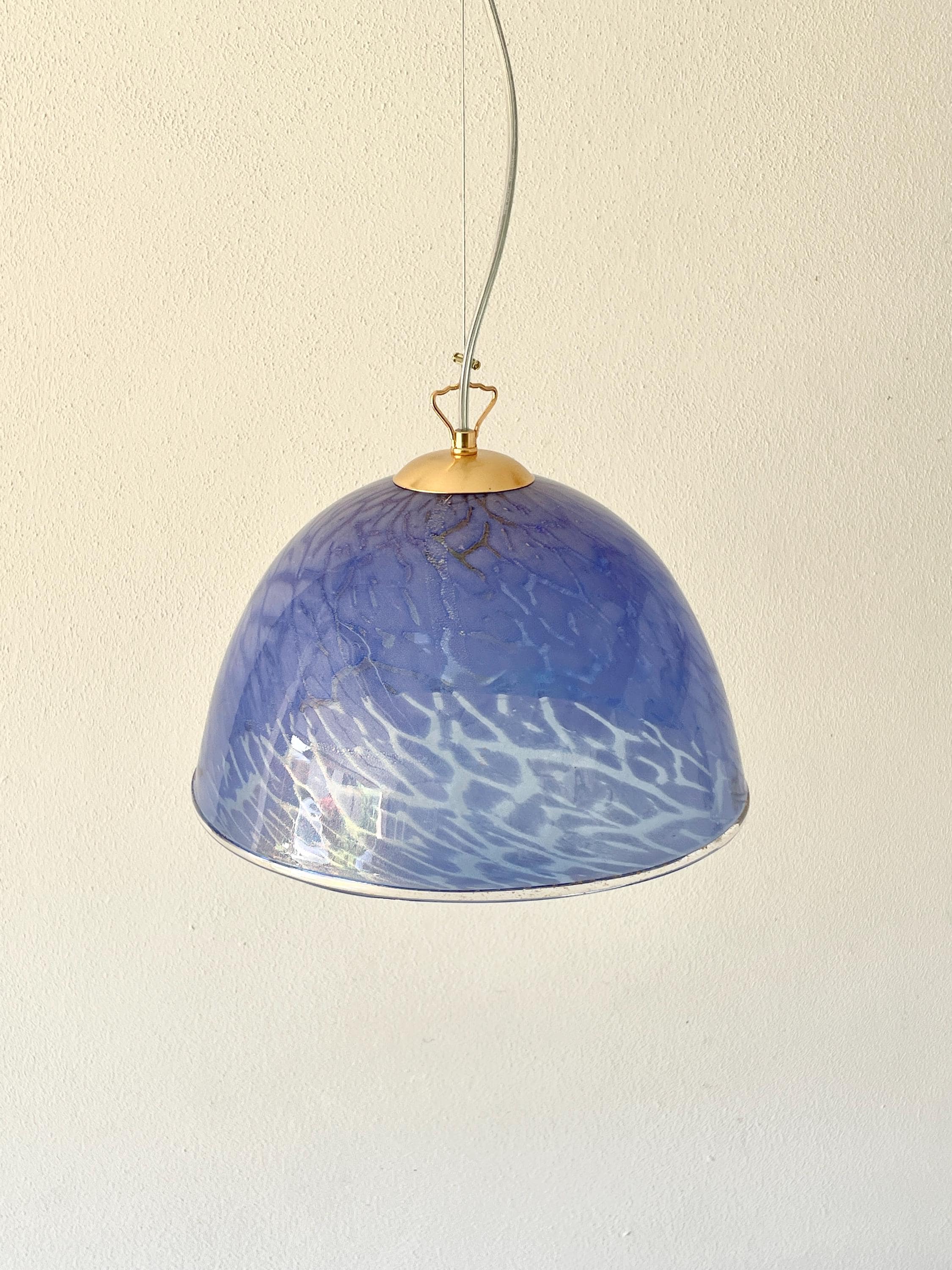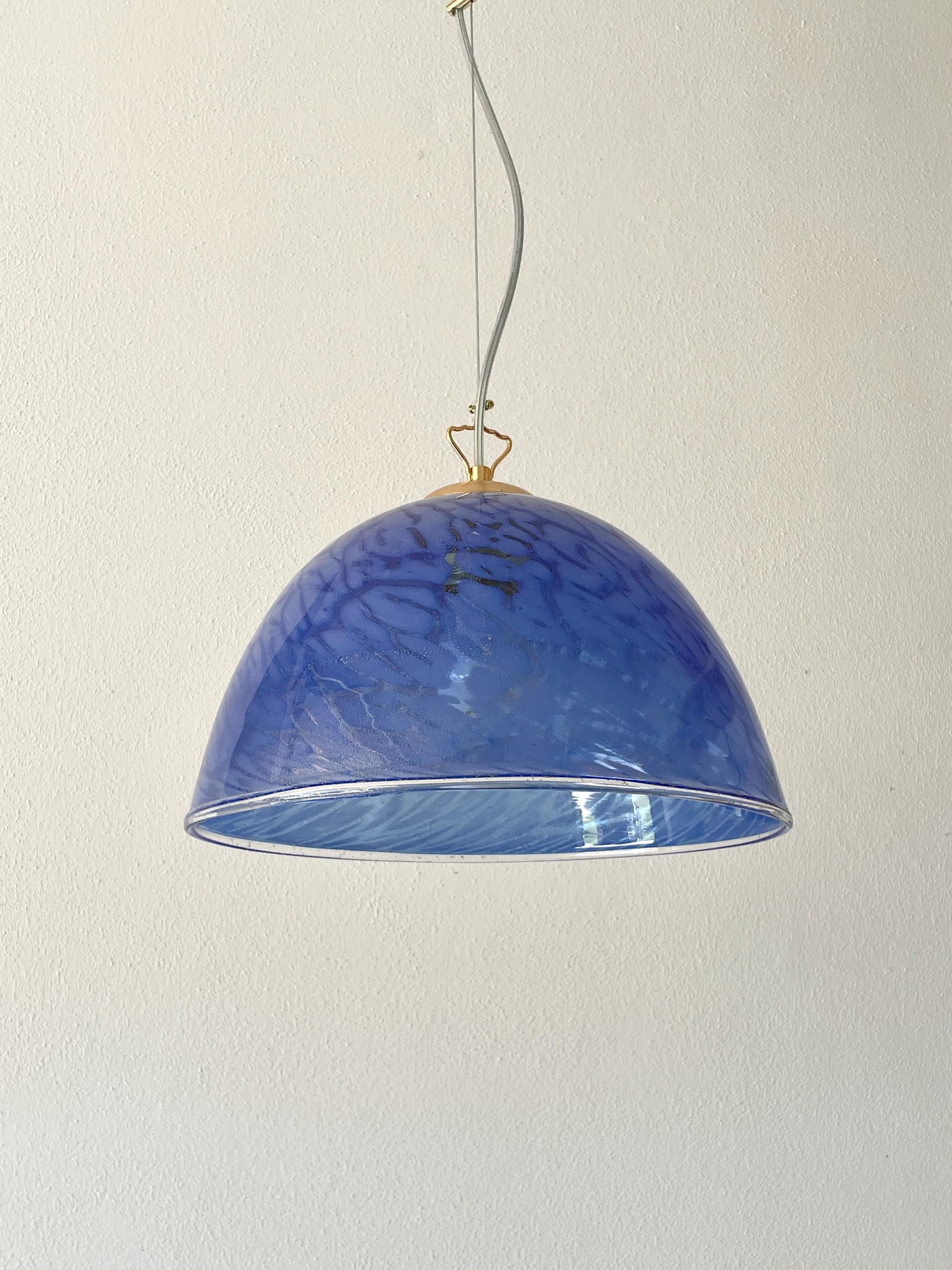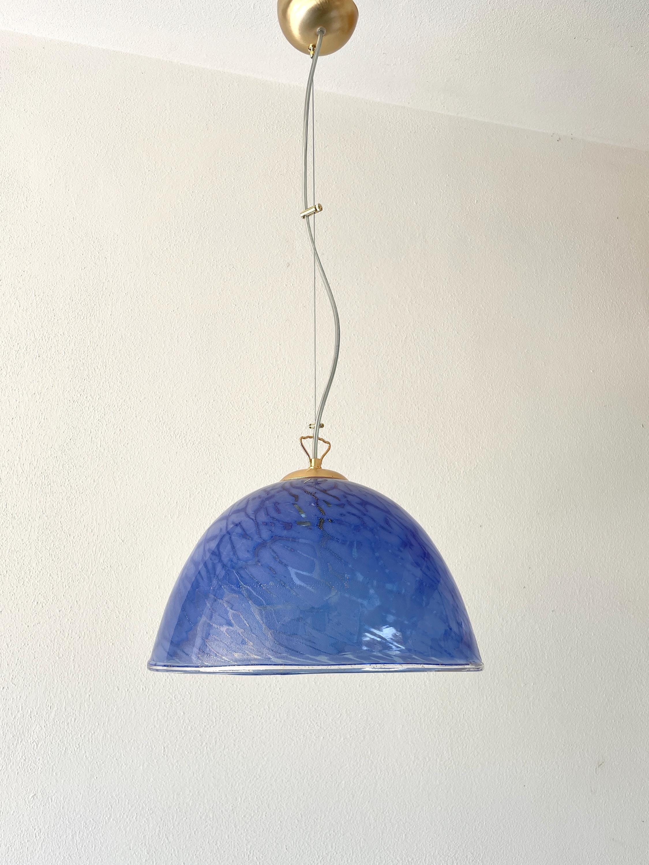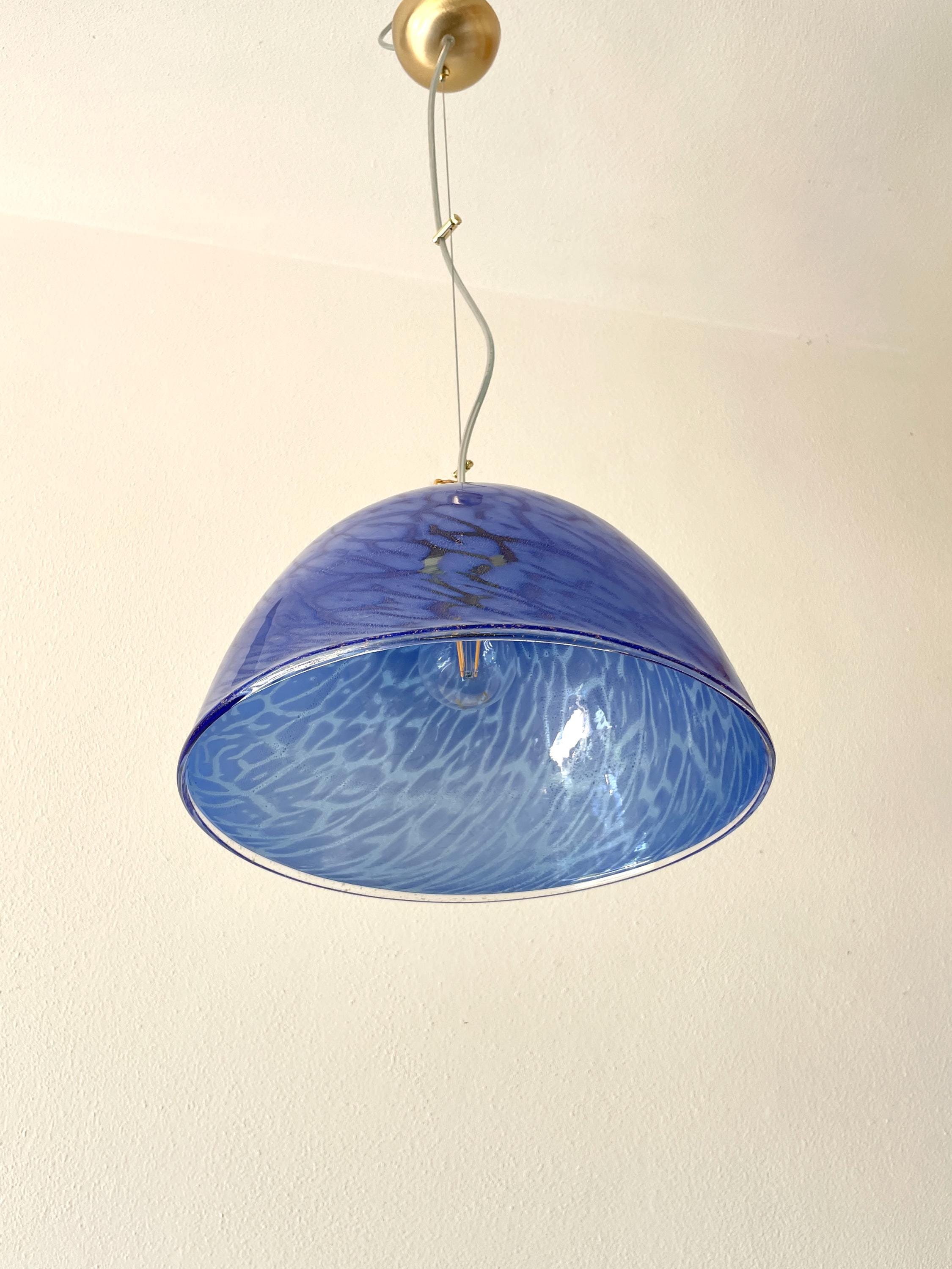 MERLETTI S32 by LA MURRINA is a splendid chandelier, vintage from the 90s, with beautiful Murano glass, mouth-blown and hand-crafted by the master glassmakers of La Murrina, the glass has a beautiful shade of blue with a delicate gold leaf motif, it is embellished with a transparent incalmo on the edge.